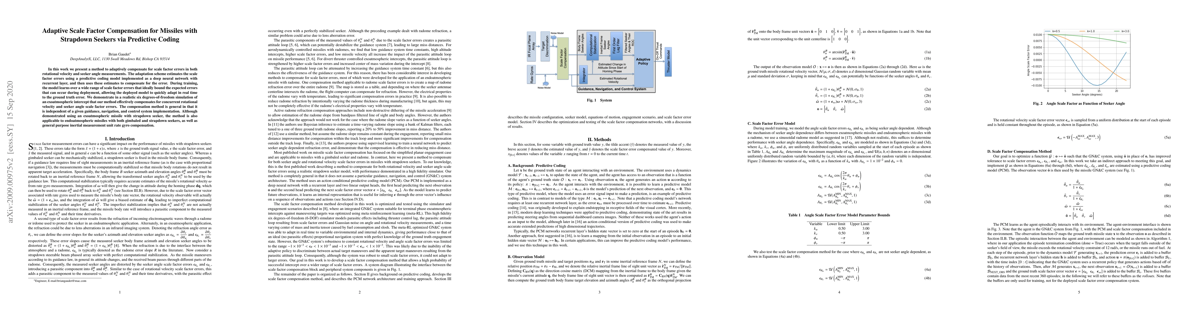 In this work we present a method to adaptively compensate for scale factor errors in both rotational velocity and seeker angle measurements. The adaptation scheme estimates the scale factor errors using a predictive coding model implemented as a deep neural network with recurrent layer, and then uses these estimates to compensate for the error. During training, the model learns over a wide range of scale factor errors that ideally bound the expected errors that can occur during deployment, allowing the deployed model to quickly adapt in real time to the ground truth error. We demonstrate in a realistic six degrees-of-freedom simulation of an exoatmospheric intercept that our method effectively compensates for concurrent rotational velocity and seeker angle scale factor errors. The compensation method is general in that it is independent of a given guidance, navigation, and control system implementation. Although demonstrated using an exoatmospheric missile with strapdown seeker, the method is also applicable to endoatmospheric missiles with both gimbaled and strapdown seekers, as well as general purpose inertial measurement unit rate gyro compensation.