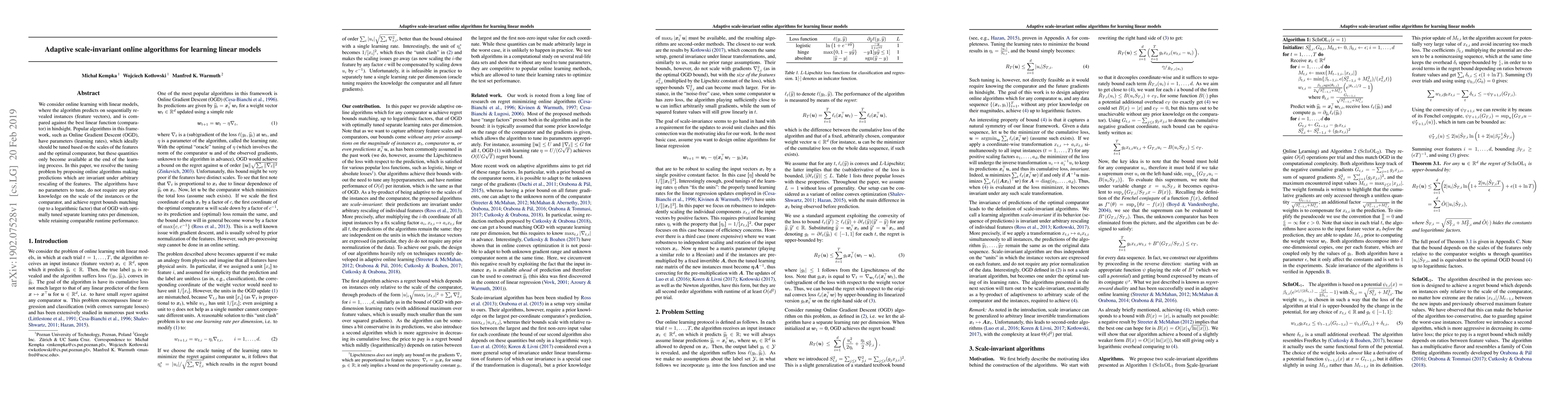 New online learning algorithms can predict linear models without tuning parameters to feature scales, achieving comparable performance to optimal tuning, and requiring no prior knowledge.