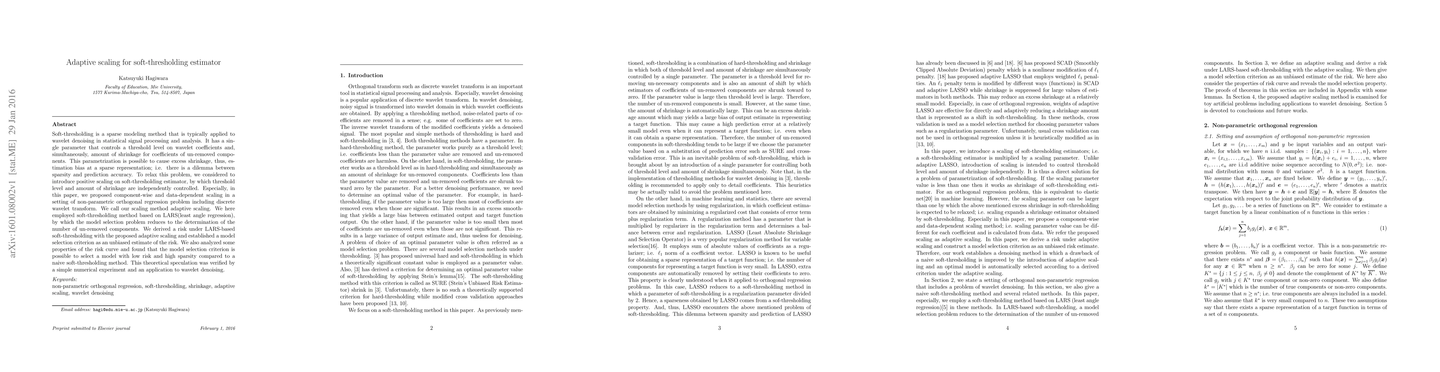 This paper proposes adaptive scaling for the soft-thresholding estimator to independently control threshold levels and shrinkage, addressing the trade-off between sparsity and prediction accuracy. The method, applied in non-parametric orthogonal regression, leverages LARS for model selection, demonstrating improved performance through theoretical analysis and empirical validation in wavelet denoising.