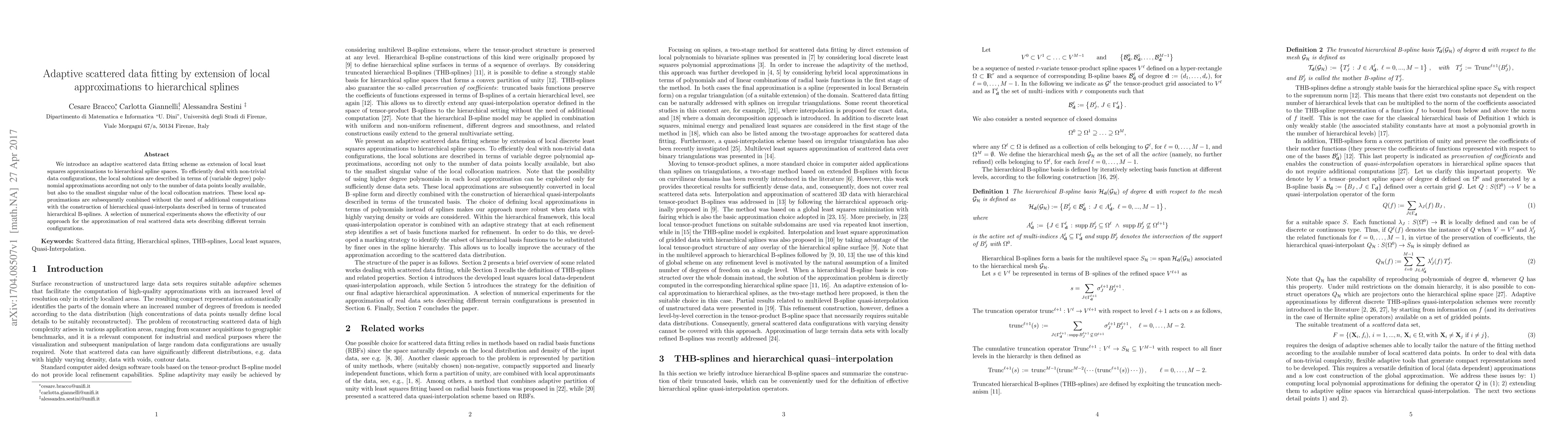 This paper proposes an adaptive scattered data fitting method that extends local least squares approximations to hierarchical spline spaces, optimizing polynomial degrees based on data point density and local matrix singular values. The method combines local approximations with hierarchical quasi-interpolants for effective terrain approximation.