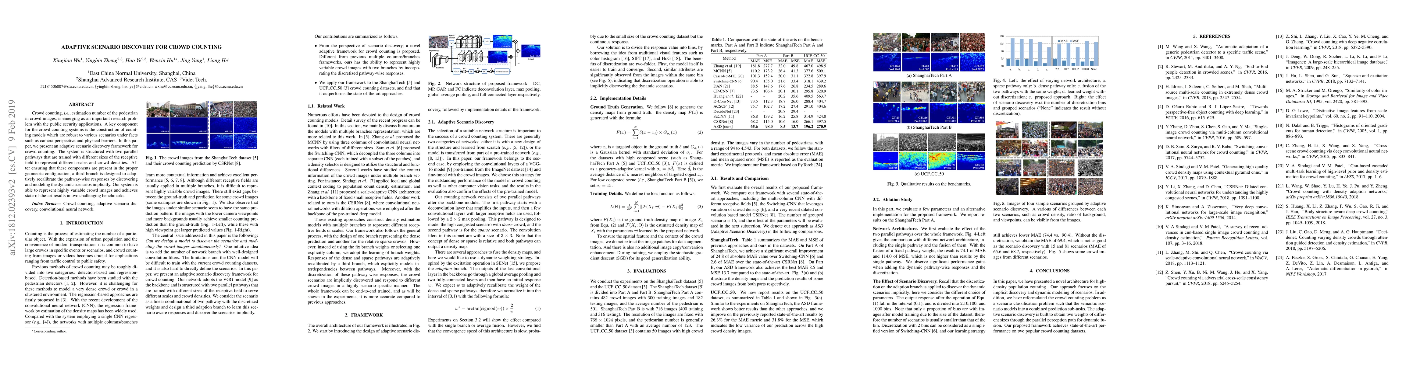 This paper introduces an adaptive scenario discovery framework for crowd counting that employs two parallel pathways with different receptive fields to handle varying scales and densities. A third branch recalibrates responses to dynamically model scenarios, achieving state-of-the-art results in crowd estimation benchmarks.