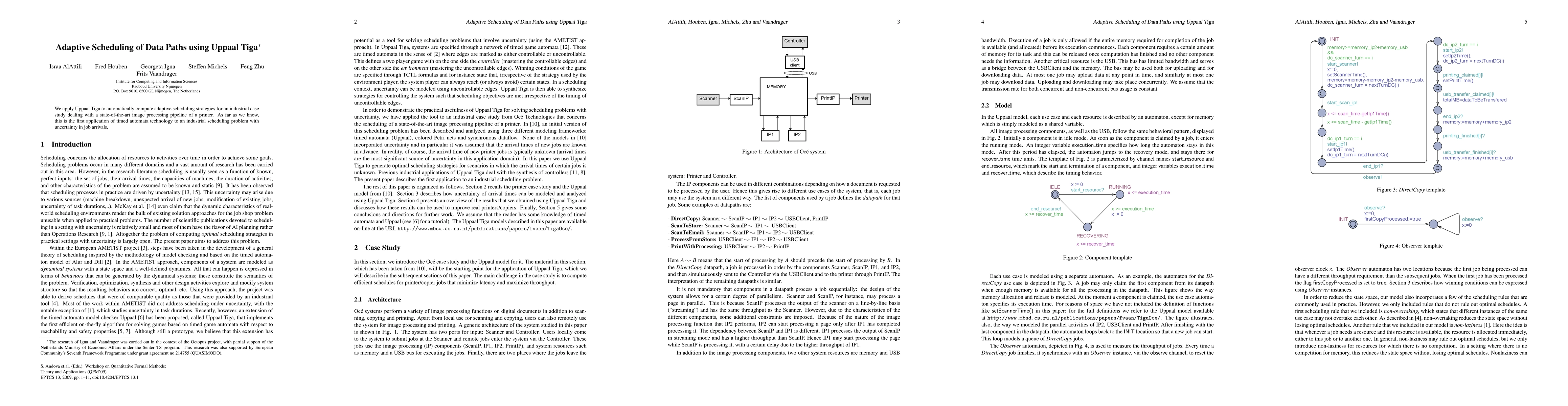 We apply Uppaal Tiga to automatically compute adaptive scheduling strategies for an industrial case study dealing with a state-of-the-art image processing pipeline of a printer. As far as we know, this is the first application of timed automata technology to an industrial scheduling problem with uncertainty in job arrivals.