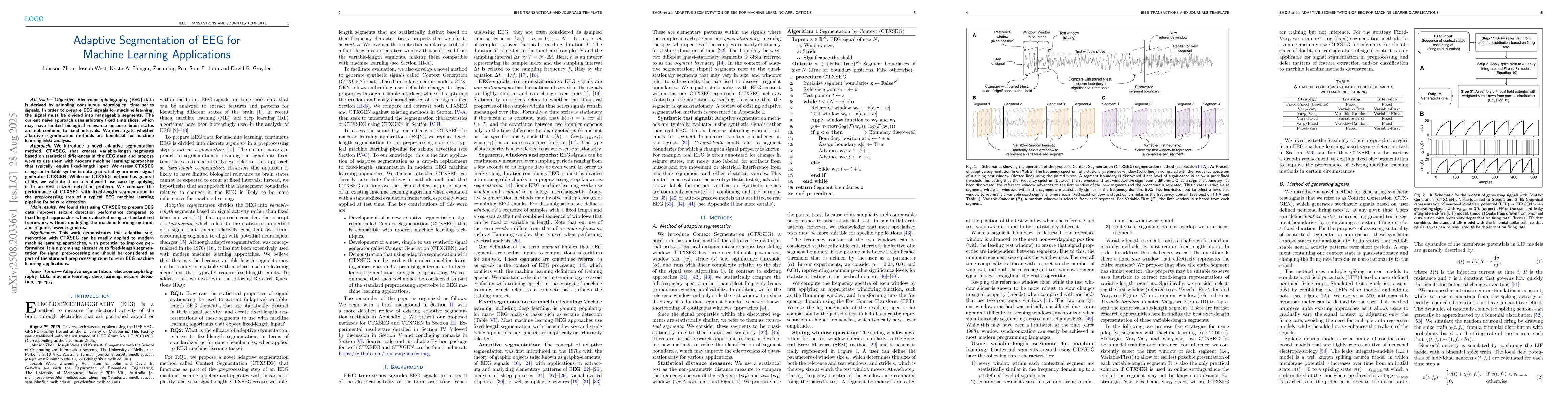 Objective. Electroencephalography (EEG) data is derived by sampling continuous neurological time series signals. In order to prepare EEG signals for machine learning, the signal must be divided into manageable segments. The current naive approach uses arbitrary fixed time slices, which may have limited biological relevance because brain states are not confined to fixed intervals. We investigate whether adaptive segmentation methods are beneficial for machine learning EEG analysis. Approach. We introduce a novel adaptive segmentation method, CTXSEG, that creates variable-length segments based on statistical differences in the EEG data and propose ways to use them with modern machine learning approaches that typically require fixed-length input. We assess CTXSEG using controllable synthetic data generated by our novel signal generator CTXGEN. While our CTXSEG method has general utility, we validate it on a real-world use case by applying it to an EEG seizure detection problem. We compare the performance of CTXSEG with fixed-length segmentation in the preprocessing step of a typical EEG machine learning pipeline for seizure detection. Main results. We found that using CTXSEG to prepare EEG data improves seizure detection performance compared to fixed-length approaches when evaluated using a standardized framework, without modifying the machine learning method, and requires fewer segments. Significance. This work demonstrates that adaptive segmentation with CTXSEG can be readily applied to modern machine learning approaches, with potential to improve performance. It is a promising alternative to fixed-length segmentation for signal preprocessing and should be considered as part of the standard preprocessing repertoire in EEG machine learning applications.