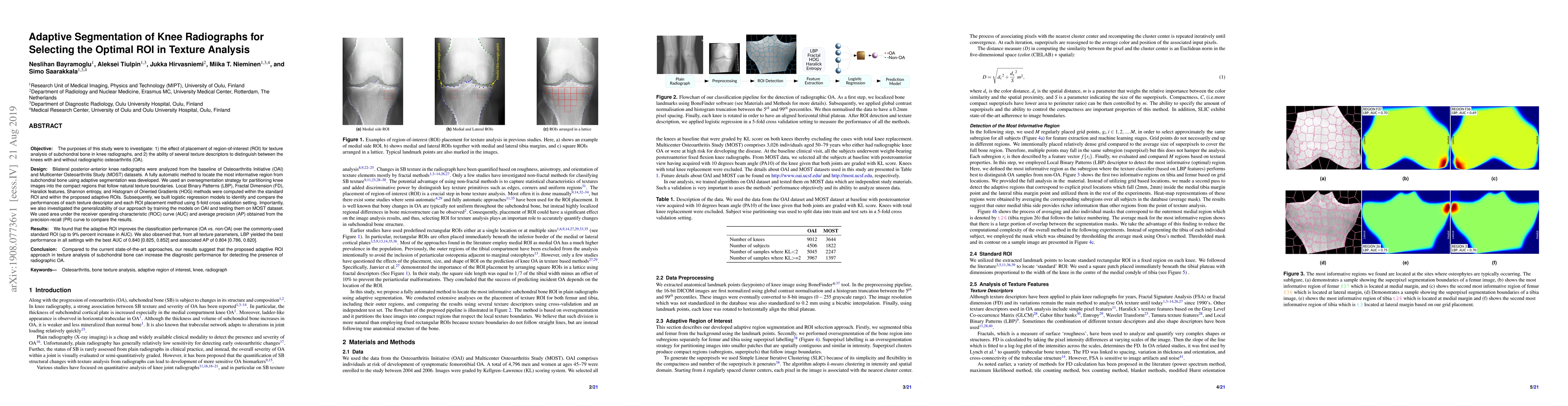 This study developed an adaptive segmentation method to automatically identify optimal regions of interest (ROI) in knee radiographs for texture analysis, improving the differentiation between knees with and without osteoarthritis (OA). The adaptive ROI showed a 9% increase in AUC compared to standard ROIs, with Local Binary Patterns (LBP) yielding the best classification performance.