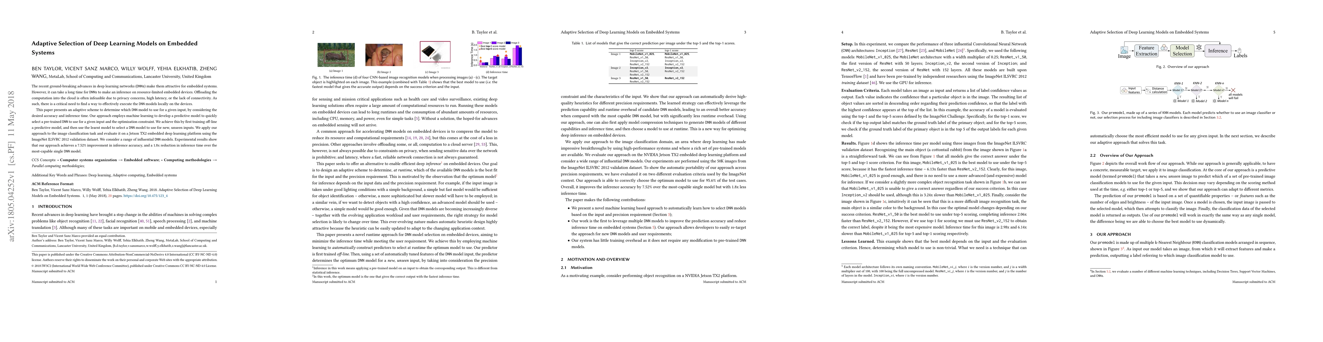 The recent ground-breaking advances in deep learning networks ( DNNs ) make them attractive for embedded systems. However, it can take a long time for DNNs to make an inference on resource-limited embedded devices. Offloading the computation into the cloud is often infeasible due to privacy concerns, high latency, or the lack of connectivity. As such, there is a critical need to find a way to effectively execute the DNN models locally on the devices. This paper presents an adaptive scheme to determine which DNN model to use for a given input, by considering the desired accuracy and inference time. Our approach employs machine learning to develop a predictive model to quickly select a pre-trained DNN to use for a given input and the optimization constraint. We achieve this by first training off-line a predictive model, and then use the learnt model to select a DNN model to use for new, unseen inputs. We apply our approach to the image classification task and evaluate it on a Jetson TX2 embedded deep learning platform using the ImageNet ILSVRC 2012 validation dataset. We consider a range of influential DNN models. Experimental results show that our approach achieves a 7.52% improvement in inference accuracy, and a 1.8x reduction in inference time over the most-capable single DNN model.
