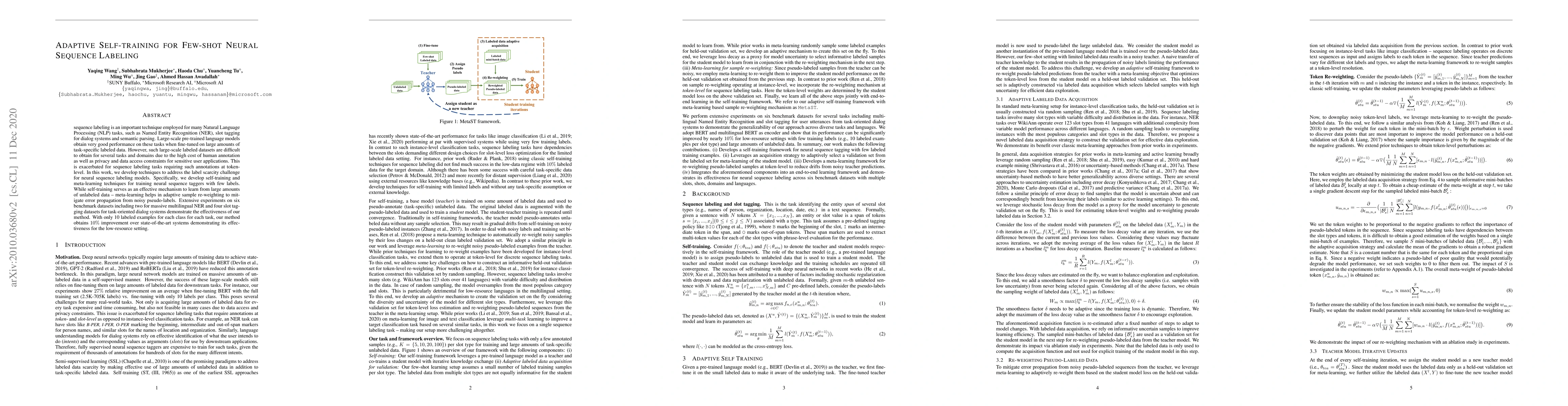 This paper proposes adaptive self-training and meta-learning techniques to enhance neural sequence labeling models under low-resource conditions, achieving a 10% improvement over state-of-the-art methods using only 10 labeled examples per class across various benchmarks.
