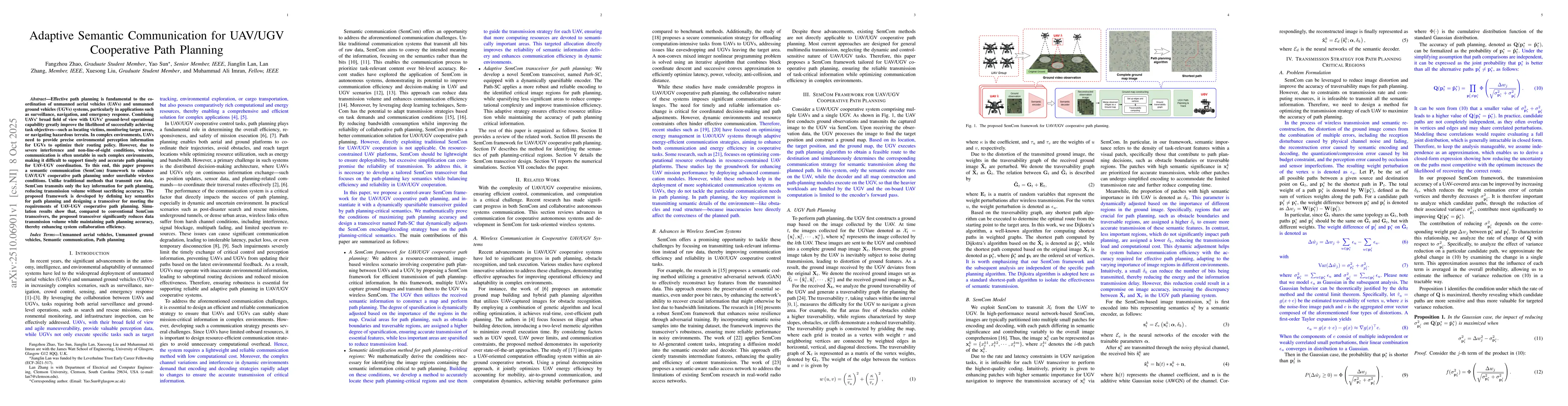 The research proposes a SemCom framework for UAV/UGV cooperative path planning, focusing on task-relevant semantic information to reduce data transmission while maintaining path planning accuracy. It theoretically identifies critical regions for accurate path planning and designs a transmission strategy prioritizing these regions. A SemCom transceiver tailored for dynamic and resource-constrained UAV/UGV environments is developed.