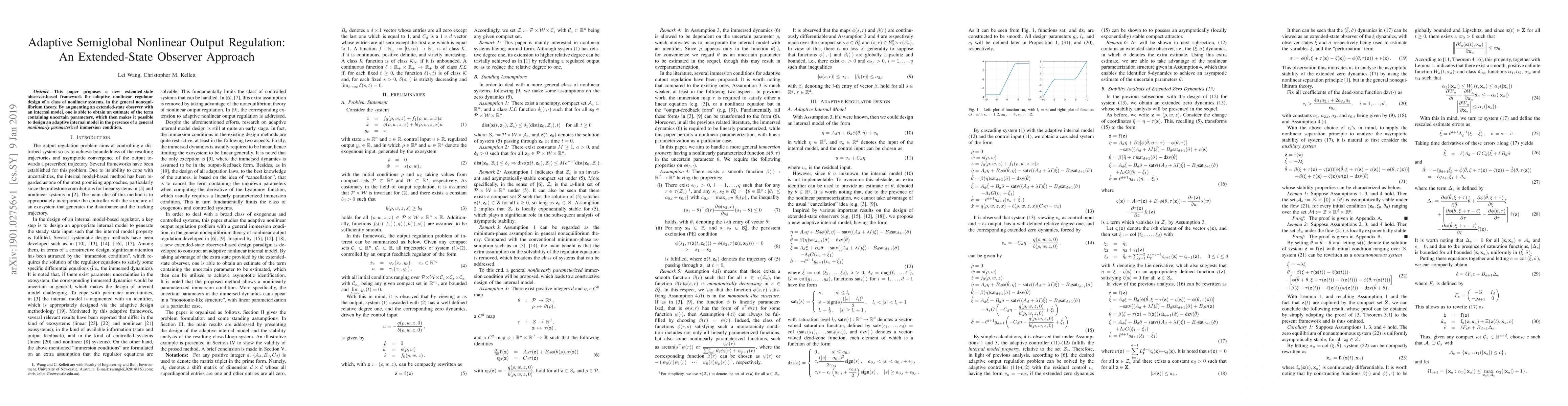 This paper proposes a new extended-state observer-based framework for adaptive nonlinear regulator design of a class of nonlinear systems, in the general nonequilibrium theory. By augmenting an extended-state observer with an internal model, one is able to obtain an estimate of the term containing uncertain parameters, which then makes it possible to design an adaptive internal model in the presence of a general nonlinearly parameterized immersion condition.