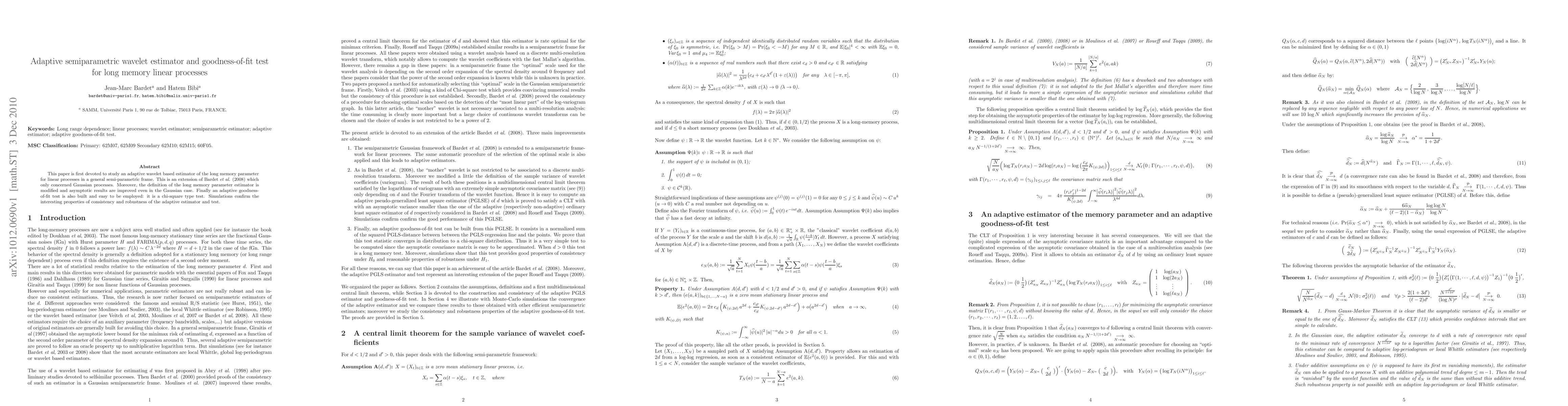 This paper proposes an adaptive wavelet estimator for the long memory parameter in semi-parametric linear processes, extending previous work to non-Gaussian cases. It also introduces an adaptive goodness-of-fit test, confirmed by simulations to be consistent and robust.