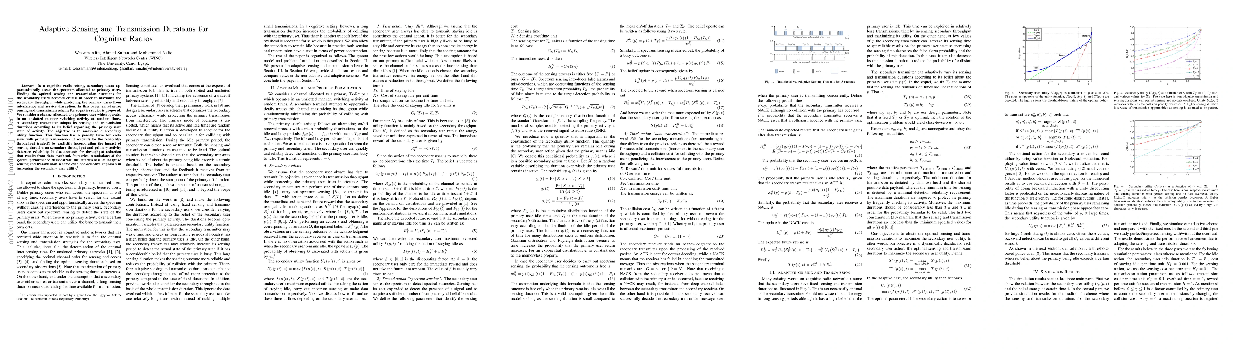 This paper proposes an adaptive sensing and transmission scheme for cognitive radios to maximize secondary throughput while minimizing interference to primary users. The scheme dynamically adjusts sensing and transmission durations based on the primary user's activity, demonstrating improved secondary utility through numerical simulations compared to non-adaptive methods.