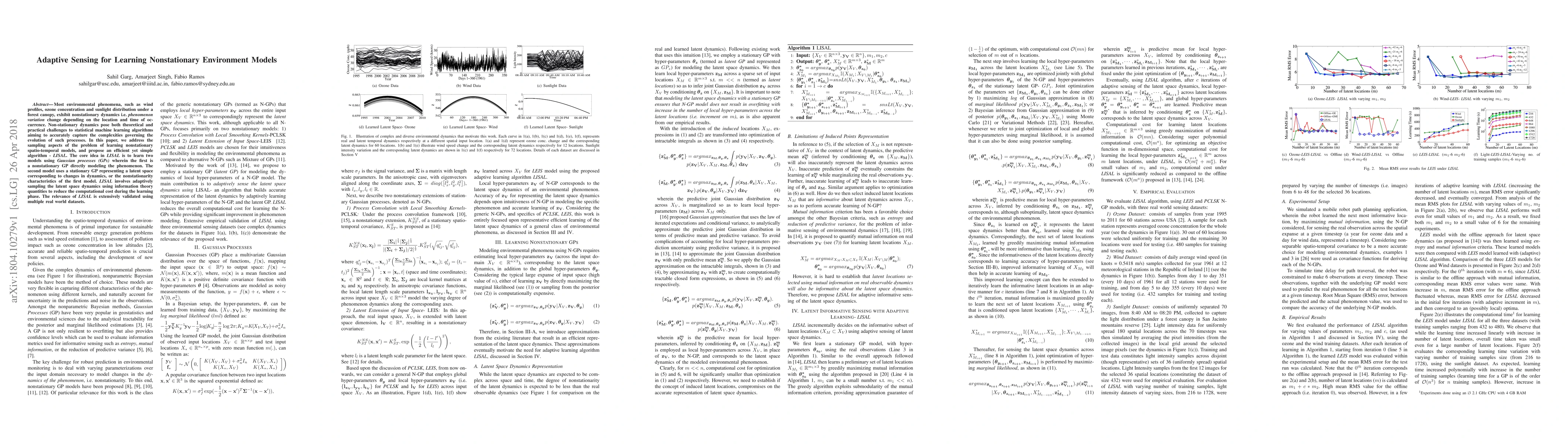 This paper proposes LISAL, an adaptive sensing algorithm for learning nonstationary spatio-temporal models using Gaussian processes. LISAL employs two models: a nonstationary GP and a stationary GP for latent dynamics, with adaptive sampling to reduce computational costs, validated through real-world datasets.