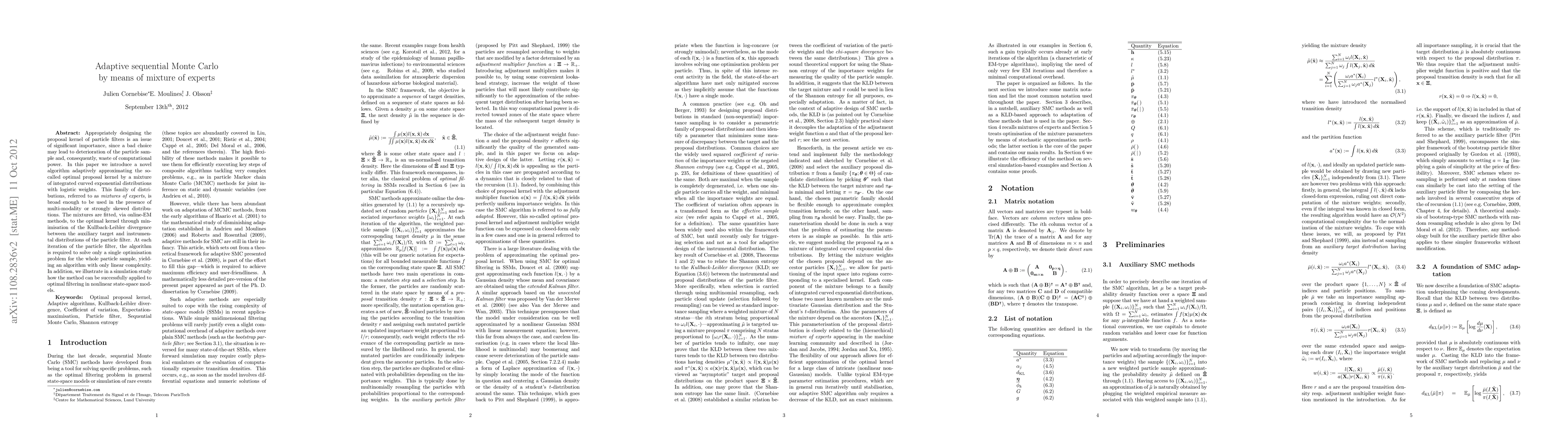 Appropriately designing the proposal kernel of particle filters is an issue of significant importance, since a bad choice may lead to deterioration of the particle sample and, consequently, waste of computational power. In this paper we introduce a novel algorithm adaptively approximating the so-called optimal proposal kernel by a mixture of integrated curved exponential distributions with logistic weights. This family of distributions, referred to as mixtures of experts, is broad enough to be used in the presence of multi-modality or strongly skewed distributions. The mixtures are fitted, via online-EM methods, to the optimal kernel through minimisation of the Kullback-Leibler divergence between the auxiliary target and instrumental distributions of the particle filter. At each iteration of the particle filter, the algorithm is required to solve only a single optimisation problem for the whole particle sample, yielding an algorithm with only linear complexity. In addition, we illustrate in a simulation study how the method can be successfully applied to optimal filtering in nonlinear state-space models.
