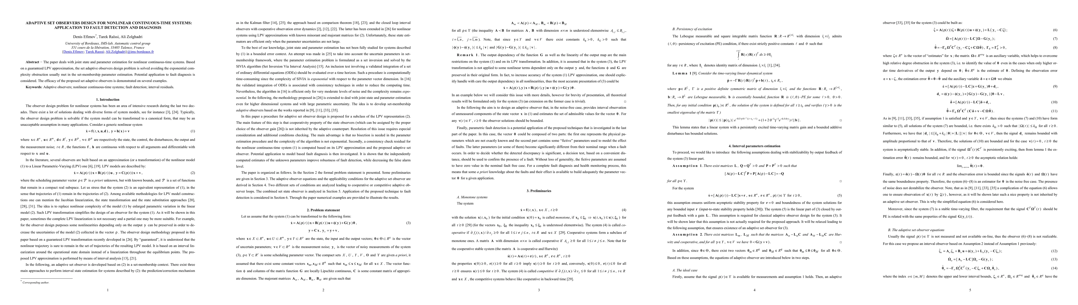 The paper proposes adaptive set observers for nonlinear continuous-time systems, addressing state and parameter estimation through a guaranteed LPV approximation, and demonstrates their potential application in fault detection and diagnosis. The method avoids the usual exponential complexity in set-membership parameter estimation.