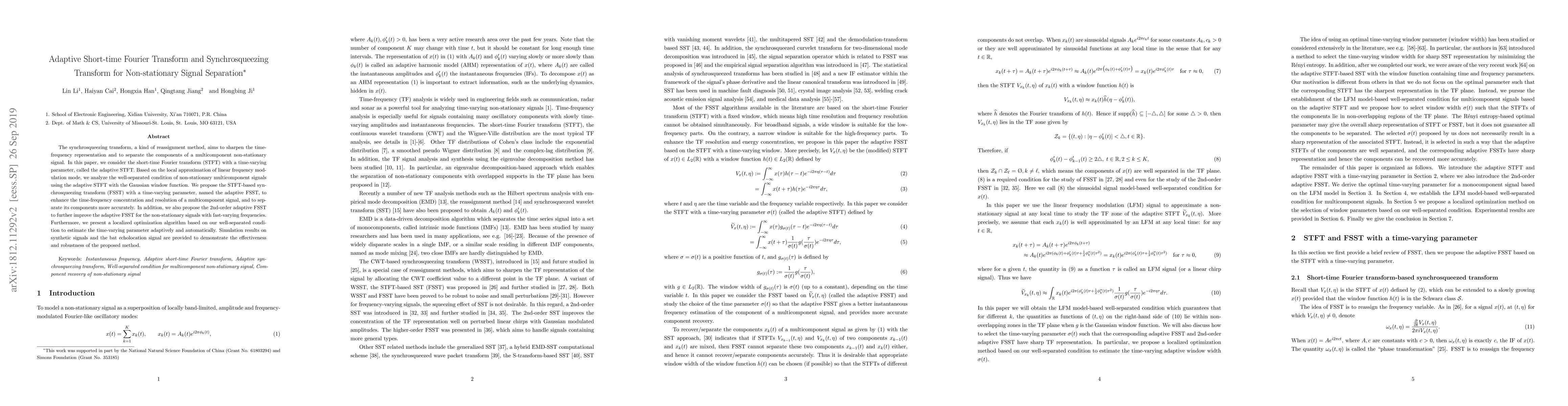 This paper proposes an adaptive Short-time Fourier Transform (STFT) and an adaptive Synchrosqueezing Transform (FSST) for separating components of non-stationary signals. The adaptive FSST enhances time-frequency concentration and resolution, with a 2nd-order version for signals with rapidly changing frequencies, and a localized optimization algorithm for adaptive parameter estimation.