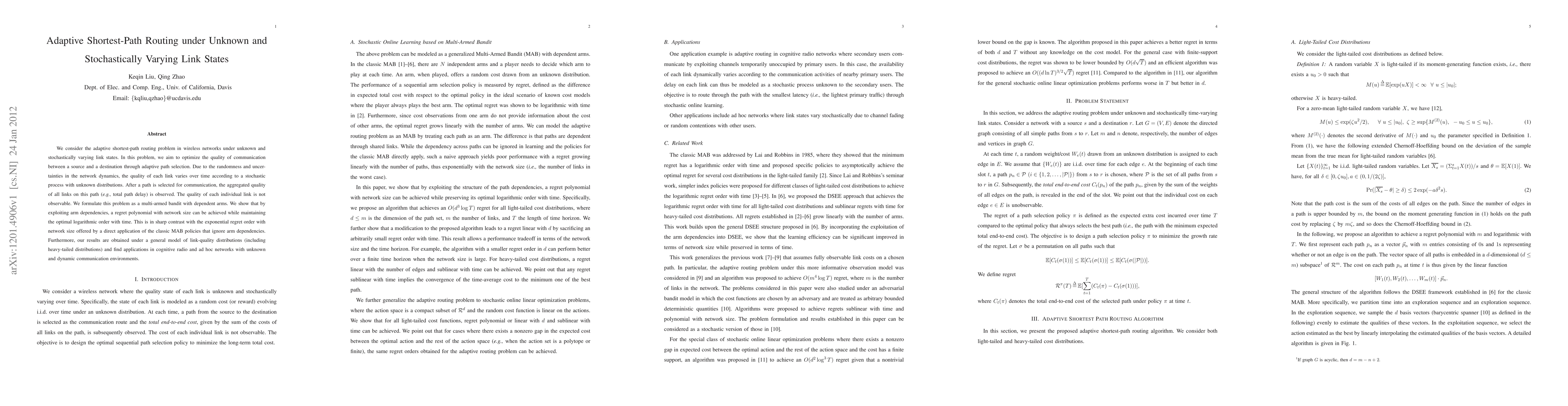 This paper addresses adaptive shortest-path routing in wireless networks with unknown and stochastically varying link states, formulating it as a multi-armed bandit problem. It achieves polynomial regret with network size by exploiting arm dependencies, contrasting with exponential regret from classic MAB policies.