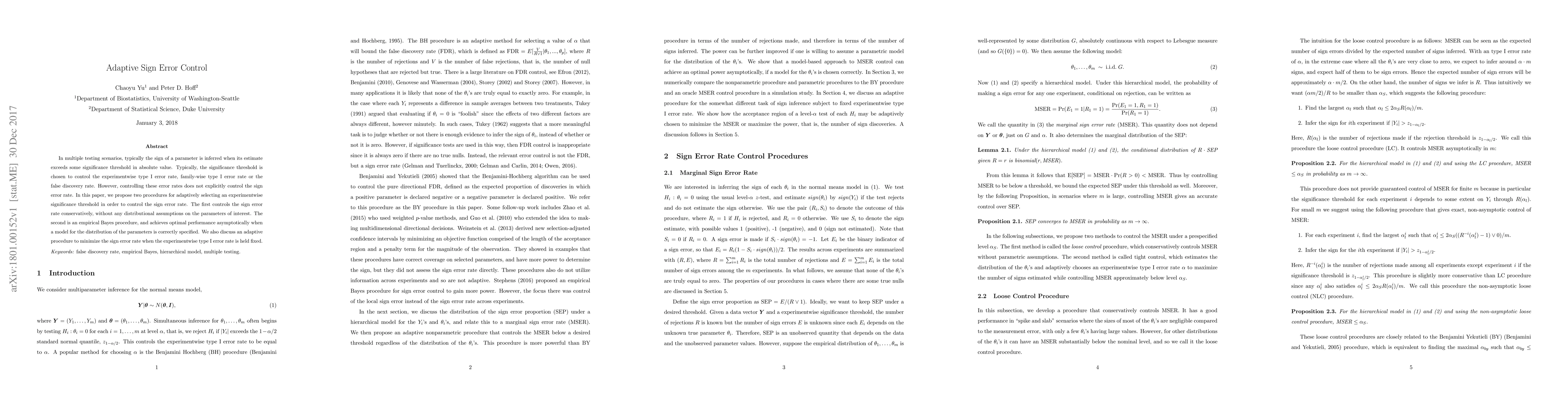 In multiple testing scenarios, typically the sign of a parameter is inferred when its estimate exceeds some significance threshold in absolute value. Typically, the significance threshold is chosen to control the experimentwise type I error rate, family-wise type I error rate or the false discovery rate. However, controlling these error rates does not explicitly control the sign error rate. In this paper, we propose two procedures for adaptively selecting an experimentwise significance threshold in order to control the sign error rate. The first controls the sign error rate conservatively, without any distributional assumptions on the parameters of interest. The second is an empirical Bayes procedure, and achieves optimal performance asymptotically when a model for the distribution of the parameters is correctly specified. We also discuss an adaptive procedure to minimize the sign error rate when the experimentwise type I error rate is held fixed.