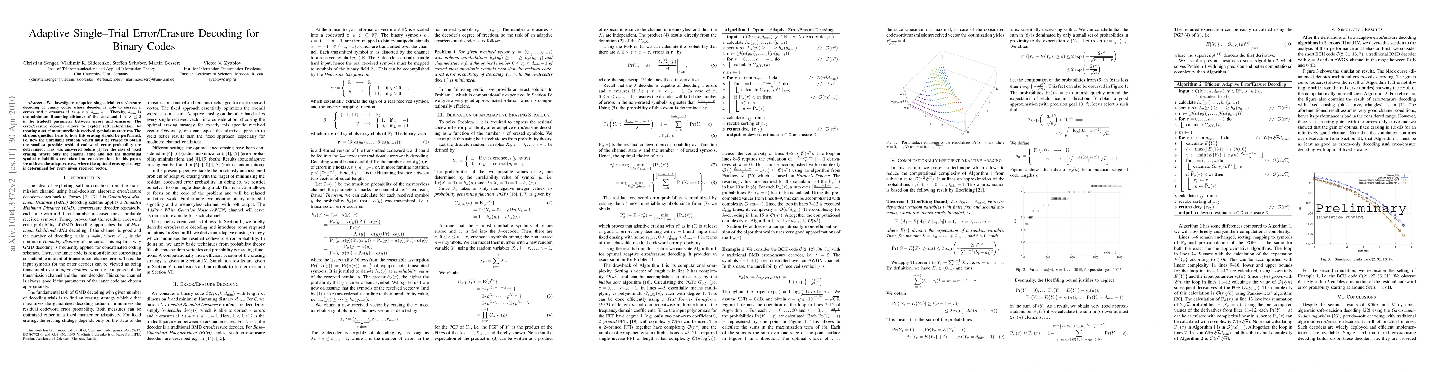 This research proposes an adaptive single-trial error/erasure decoding method for binary codes, enabling correction of e errors and t erasures under specific conditions. Unlike fixed strategies, this approach dynamically determines which symbols to treat as erasures based on individual symbol reliabilities to minimize residual error probability.