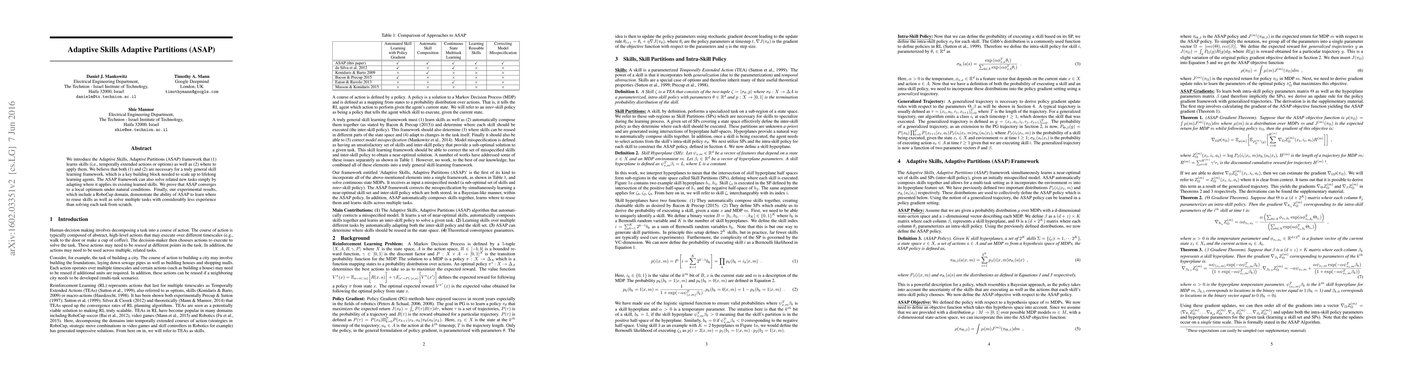 The ASAP framework learns both skills and their appropriate application contexts, enabling it to solve new tasks by adapting existing skills. Experimental results show that ASAP converges to a local optimum and outperforms learning each task from scratch, as demonstrated in a RoboCup domain.