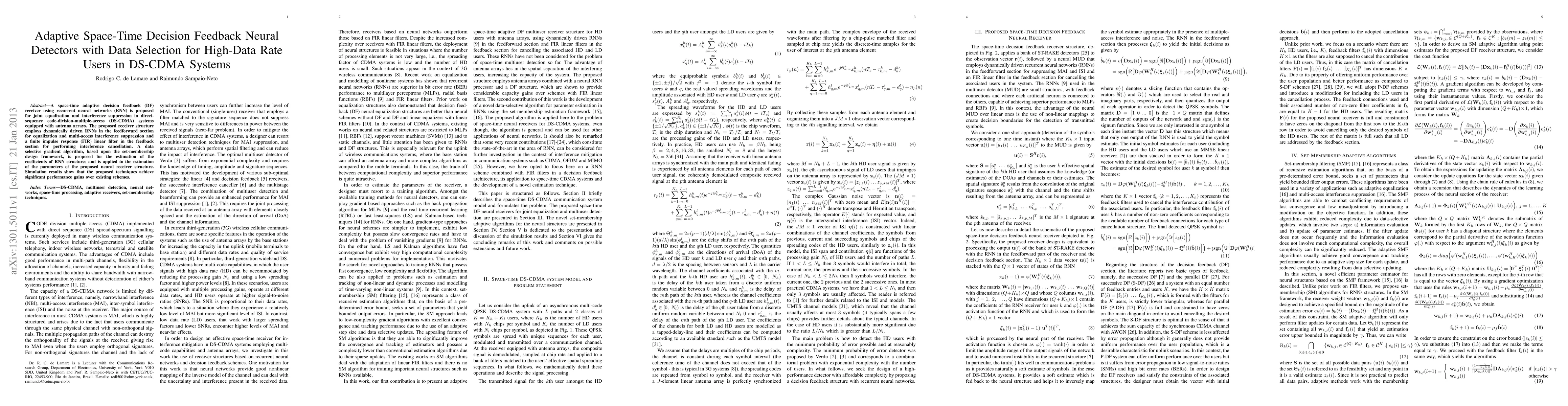 A space-time adaptive decision feedback (DF) receiver using recurrent neural networks (RNN) is proposed for joint equalization and interference suppression in direct-sequence code-division-multiple-access (DS-CDMA) systems equipped with antenna arrays. The proposed receiver structure employs dynamically driven RNNs in the feedforward section for equalization and multi-access interference suppression and a finite impulse response (FIR) linear filter in the feedback section for performing interference cancellation. A data selective gradient algorithm, based upon the set-membership design framework, is proposed for the estimation of the coefficients of RNN structures and is applied to the estimation of the parameters of the proposed neural receiver structure. Simulation results show that the proposed techniques achieve significant performance gains over existing schemes.