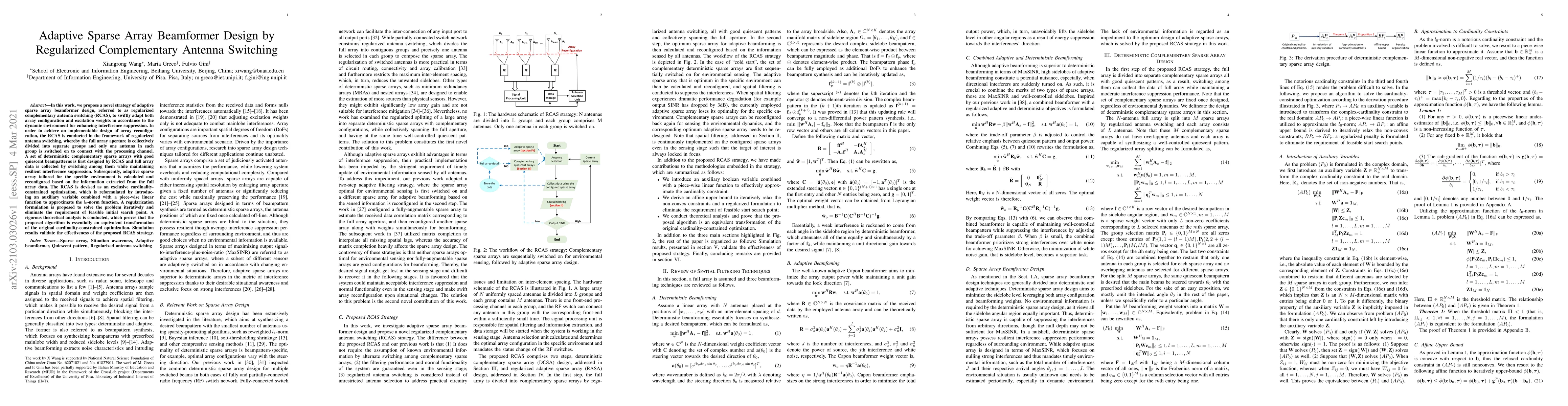 This paper proposes a novel adaptive sparse array beamformer design, called regularized complementary antenna switching (RCAS), to dynamically reconfigure antenna groups and optimize excitation weights for enhanced interference suppression. The RCAS method divides the full array into groups, activating only one antenna per group, and iteratively solves a cardinality-constrained optimization problem to achieve optimal array configuration tailored to the environment.