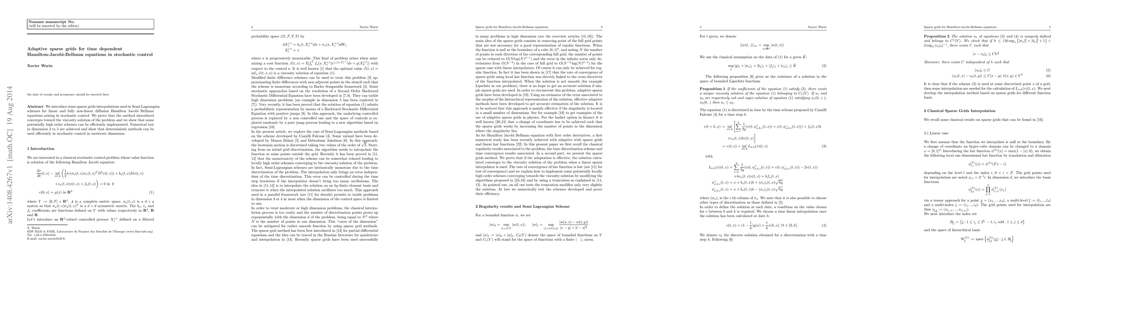 This paper introduces sparse grids interpolations in Semi-Lagrangian schemes for solving Hamilton-Jacobi-Bellman equations in stochastic control, proving convergence to viscosity solutions and demonstrating efficient implementation of high-order schemes. Numerical tests in dimensions 2 to 5 confirm the effectiveness of deterministic methods in moderate-dimensional stochastic control problems.