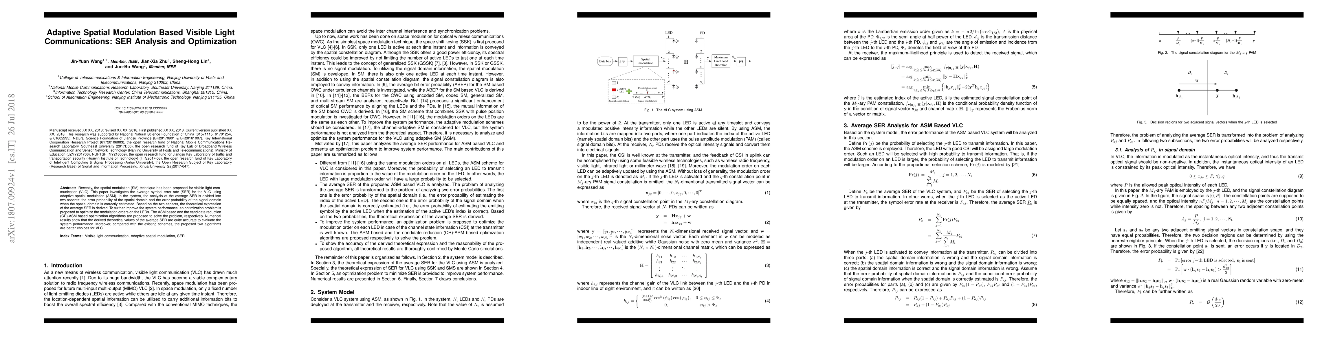This paper investigates adaptive spatial modulation (ASM) in visible light communication (VLC) to analyze and optimize the average symbol error rate (SER). It derives theoretical expressions for SER considering both spatial and signal domain errors, and proposes optimization algorithms to enhance modulation orders on LEDs, demonstrating superior performance over existing schemes.