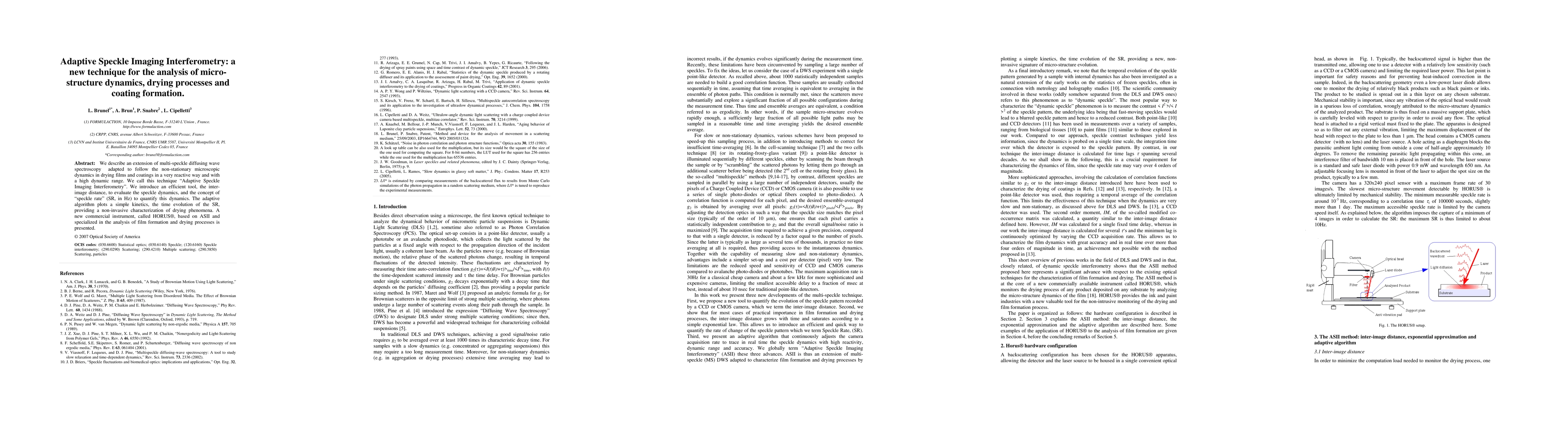 This paper introduces Adaptive Speckle Imaging Interferometry (ASII), a new technique for analyzing microstructure dynamics in drying films and coatings. It employs an adaptive algorithm to quantify microscopic dynamics using the "speckle rate" and presents a commercial instrument, HORUS, for non-invasive characterization of drying processes.