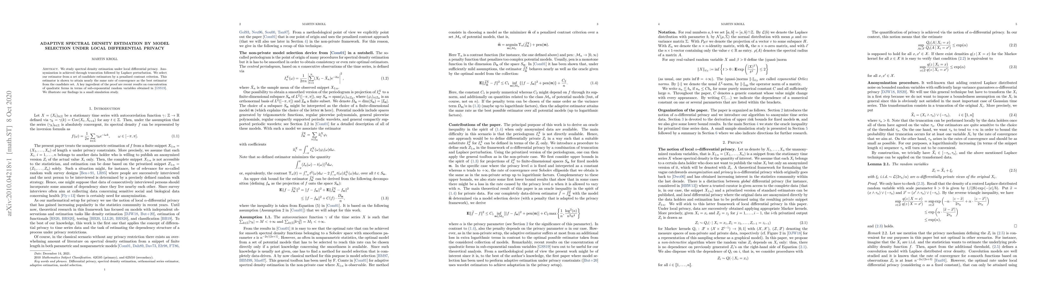 We study spectral density estimation under local differential privacy. Anonymization is achieved through truncation followed by Laplace perturbation. We select our estimator from a set of candidate estimators by a penalized contrast criterion. This estimator is shown to attain nearly the same rate of convergence as the best estimator from the candidate set. A key ingredient of the proof are recent results on concentration of quadratic forms in terms of sub-exponential random variables obtained in arXiv:1903.05964. We illustrate our findings in a small simulation study.