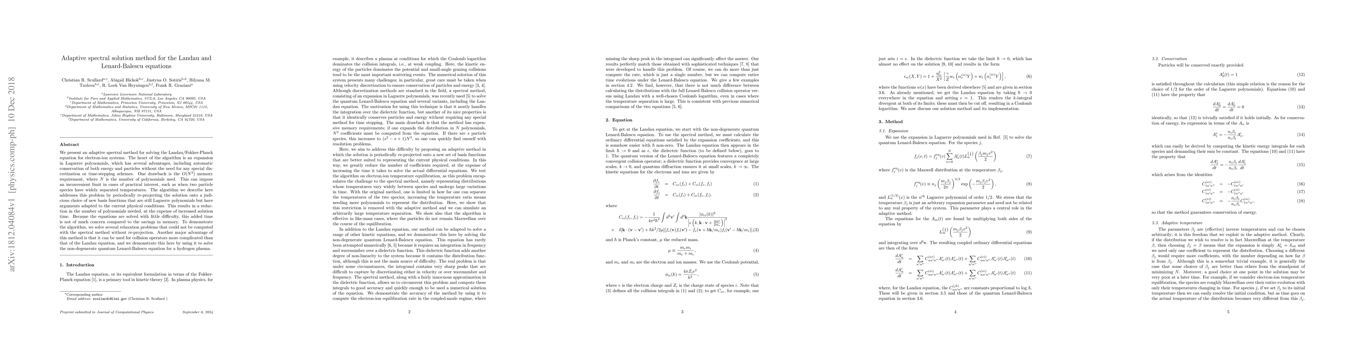 We present an adaptive spectral method for solving the Landau/Fokker-Planck equation for electron-ion systems. The heart of the algorithm is an expansion in Laguerre polynomials, which has several advantages, including automatic conservation of both energy and particles without the need for any special discretization or time-stepping schemes. One drawback is the $O(N^3)$ memory requirement, where $N$ is the number of polynomials used. This can impose an inconvenient limit in cases of practical interest, such as when two particle species have widely separated temperatures. The algorithm we describe here addresses this problem by periodically re-projecting the solution onto a judicious choice of new basis functions that are still Laguerre polynomials but have arguments adapted to the current physical conditions. This results in a reduction in the number of polynomials needed, at the expense of increased solution time. Because the equations are solved with little difficulty, this added time is not of much concern compared to the savings in memory. To demonstrate the algorithm, we solve several relaxation problems that could not be computed with the spectral method without re-projection. Another major advantage of this method is that it can be used for collision operators more complicated than that of the Landau equation, and we demonstrate this here by using it to solve the non-degenerate quantum Lenard-Balescu equation for a hydrogen plasma.