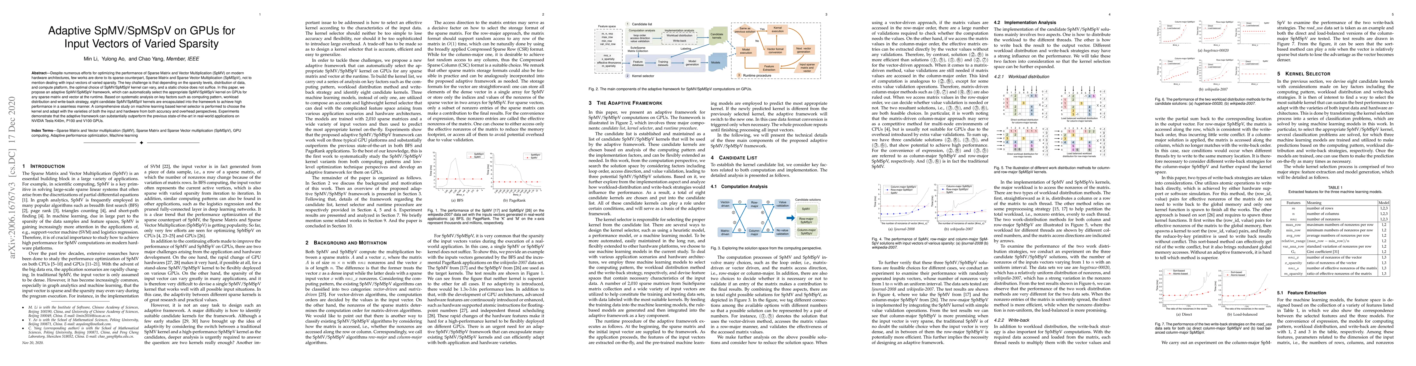 This paper proposes an adaptive framework for optimizing Sparse Matrix and Vector (SpMV) and Sparse Matrix and Sparse Vector (SpMSpV) multiplications on GPUs, capable of selecting the best kernel at runtime based on varying sparsity levels. The framework encapsulates eight kernels and employs machine learning for kernel selection, achieving superior performance compared to previous methods on multiple GPU architectures.
