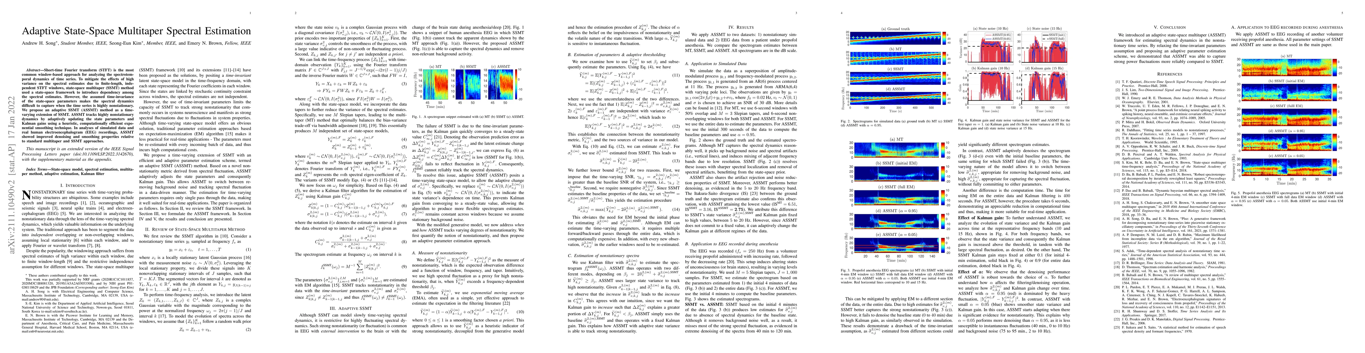 The paper proposes an adaptive state-space multitaper (ASSMT) method to improve spectral estimation for highly nonstationary time series. The ASSMT dynamically updates state parameters and Kalman gains using exponential smoothing, demonstrating superior denoising and smoothing in simulations and EEG data compared to standard methods.