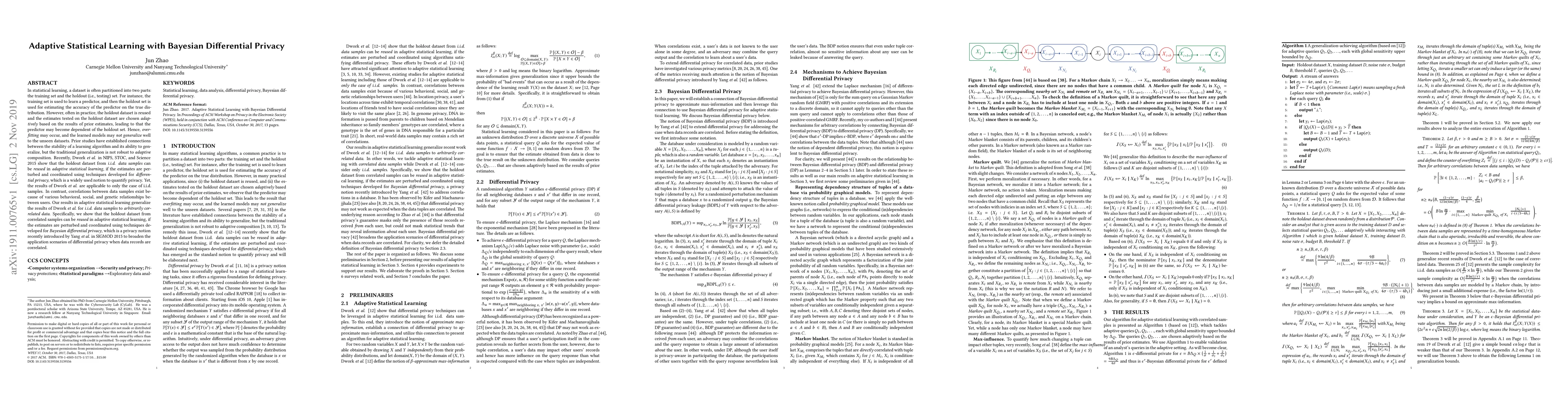 In statistical learning, a dataset is often partitioned into two parts: the training set and the holdout (i.e., testing) set. For instance, the training set is used to learn a predictor, and then the holdout set is used for estimating the accuracy of the predictor on the true distribution. However, often in practice, the holdout dataset is reused and the estimates tested on the holdout dataset are chosen adaptively based on the results of prior estimates, leading to that the predictor may become dependent of the holdout set. Hence, overfitting may occur, and the learned models may not generalize well to the unseen datasets. Prior studies have established connections between the stability of a learning algorithm and its ability to generalize, but the traditional generalization is not robust to adaptive composition. Recently, Dwork et al. in NIPS, STOC, and Science 2015 show that the holdout dataset from i.i.d. data samples can be reused in adaptive statistical learning, if the estimates are perturbed and coordinated using techniques developed for differential privacy, which is a widely used notion to quantify privacy. Yet, the results of Dwork et al. are applicable to only the case of i.i.d. samples. In contrast, correlations between data samples exist because of various behavioral, social, and genetic relationships between users. Our results in adaptive statistical learning generalize the results of Dwork et al. for i.i.d. data samples to arbitrarily correlated data. Specifically, we show that the holdout dataset from correlated samples can be reused in adaptive statistical learning, if the estimates are perturbed and coordinated using techniques developed for Bayesian differential privacy, which is a privacy notion recently introduced by Yang et al. in SIGMOD 2015 to broaden the application scenarios of differential privacy when data records are correlated.