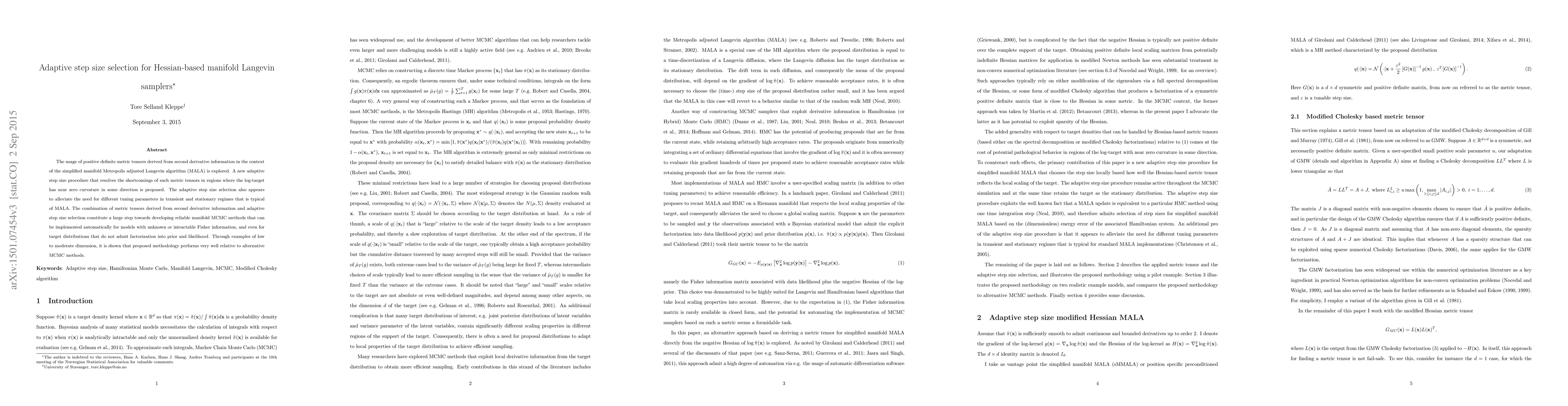 A new adaptive step size selection method is proposed for the manifold Metropolis adjusted Langevin algorithm to improve performance in low curvature regions and alleviate tuning parameter requirements.