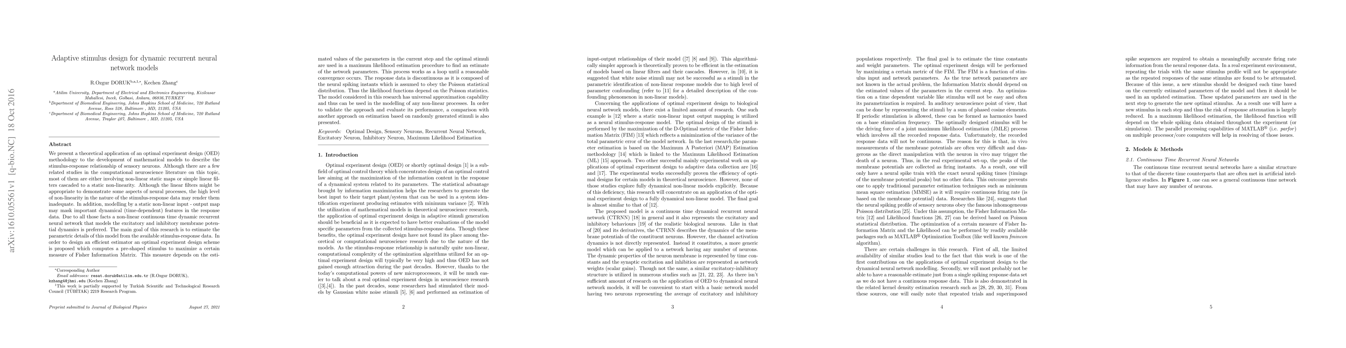 This paper proposes an adaptive stimulus design methodology using optimal experiment design (OED) to develop dynamic recurrent neural network models for describing the complex, non-linear stimulus-response relationship of sensory neurons. The approach aims to estimate model parameters by maximizing Fisher Information Matrix through a loop of pre-shaped stimuli and maximum likelihood estimation, validated against a random stimulus-based approach.