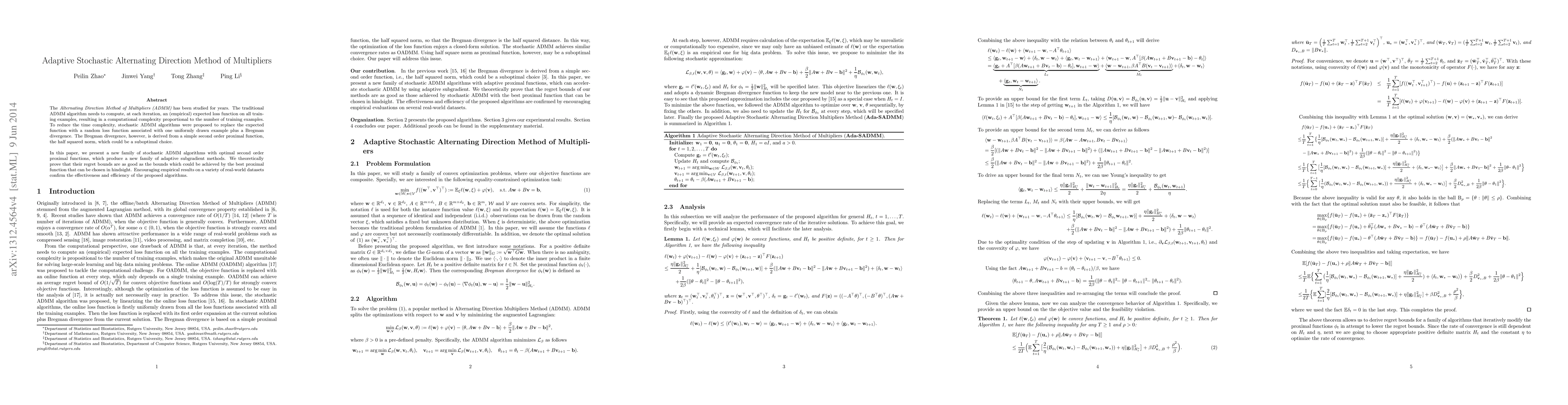 This paper introduces adaptive stochastic ADMM algorithms that utilize optimal second-order proximal functions, improving upon traditional methods. The proposed algorithms achieve comparable regret bounds to the best possible choice of proximal functions, validated by empirical results on various real-world datasets.