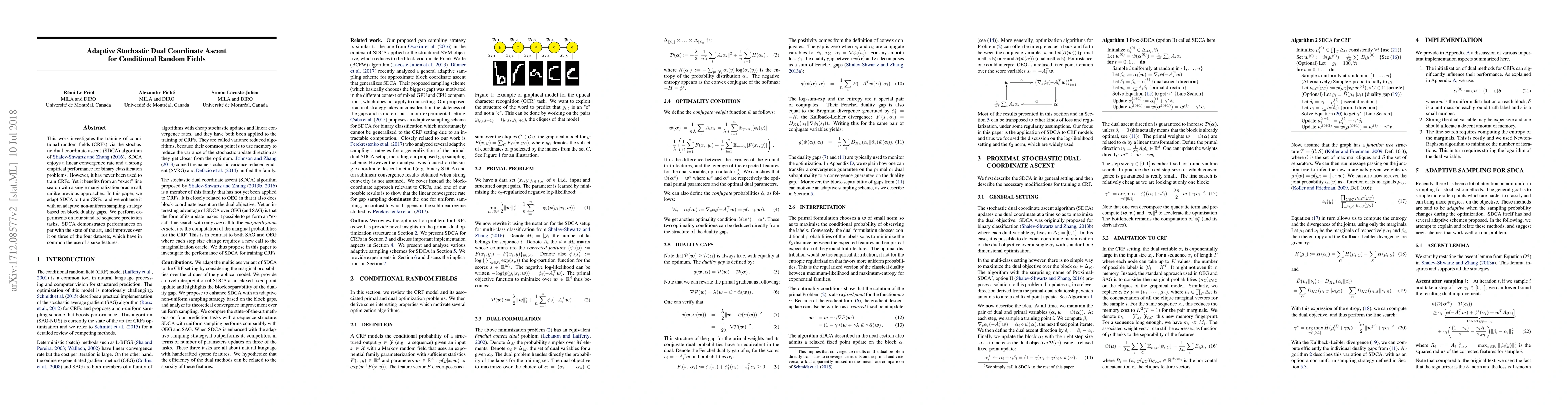 This paper adapts the stochastic dual coordinate ascent (SDCA) algorithm for training conditional random fields (CRFs) and enhances it with an adaptive sampling strategy. Experiments show SDCA performs competitively with state-of-the-art methods, especially on datasets with sparse features.
