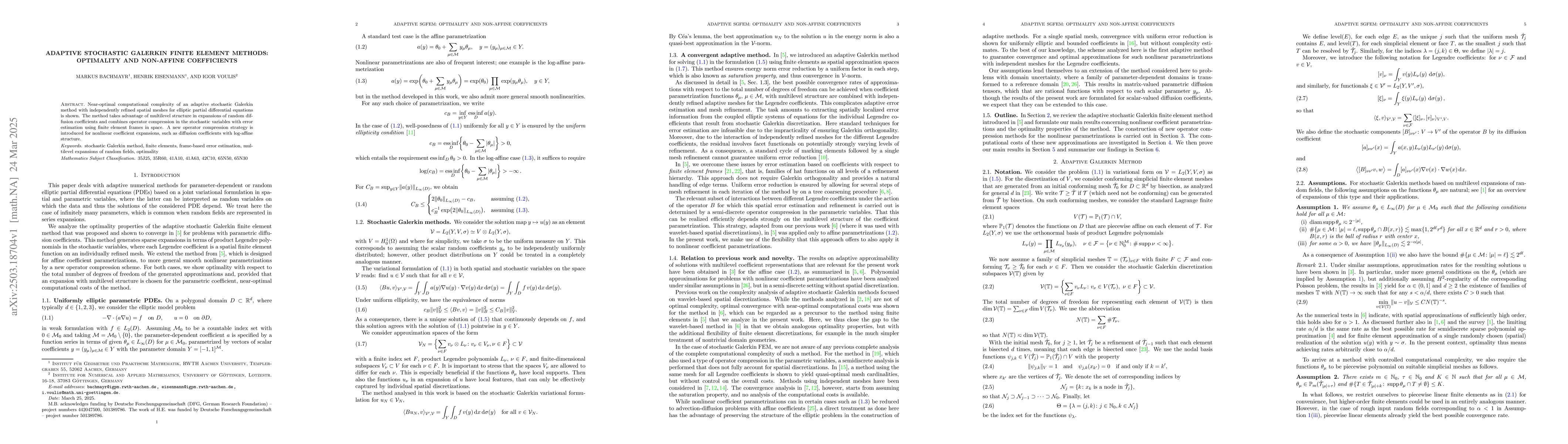 The research employs an adaptive stochastic Galerkin finite element method with independently refined spatial meshes for elliptic PDEs, leveraging multilevel structure in random diffusion coefficient expansions and combining operator compression in stochastic variables with finite element-based error estimation in space.