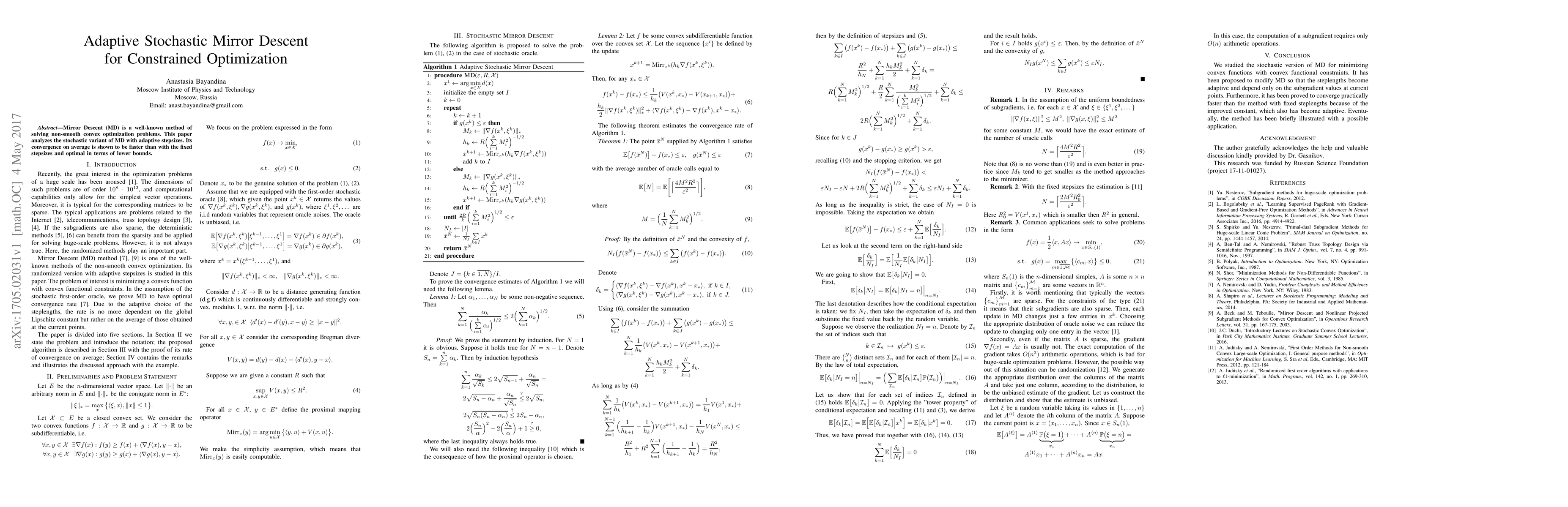 Summary: This paper introduces an adaptive stochastic variant of Mirror Descent for solving non-smooth convex optimization problems, demonstrating faster average convergence and optimal performance compared to fixed stepsize methods.