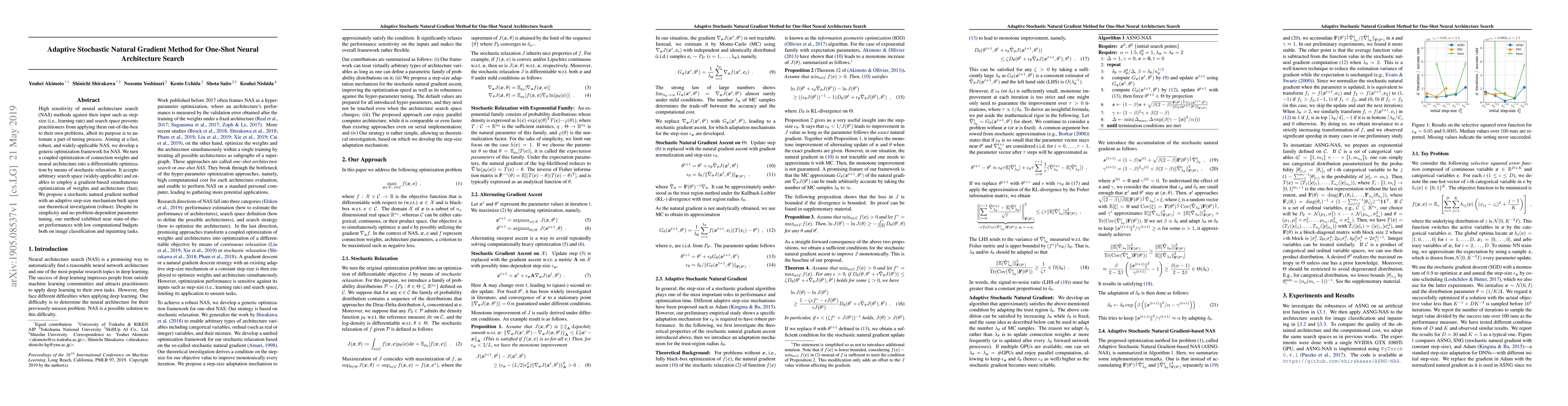 This paper introduces an adaptive stochastic natural gradient method for one-shot neural architecture search, aiming for fast, robust, and widely-applicable optimization. The method combines differentiable optimization and stochastic relaxation, achieving state-of-the-art performance with minimal computational costs.