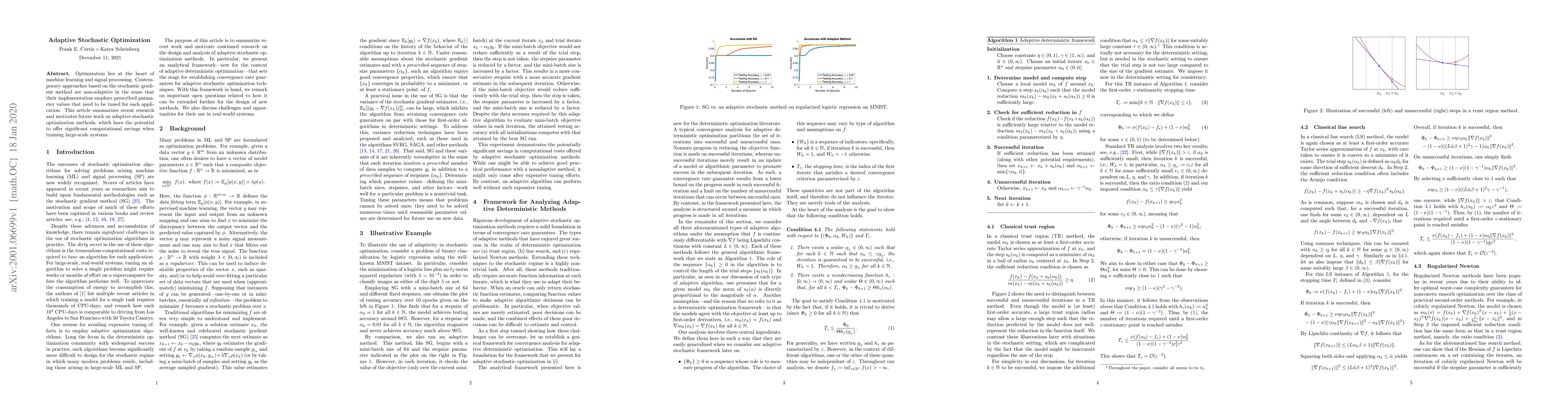 Optimization lies at the heart of machine learning and signal processing. Contemporary approaches based on the stochastic gradient method are non-adaptive in the sense that their implementation employs prescribed parameter values that need to be tuned for each application. This article summarizes recent research and motivates future work on adaptive stochastic optimization methods, which have the potential to offer significant computational savings when training large-scale systems.