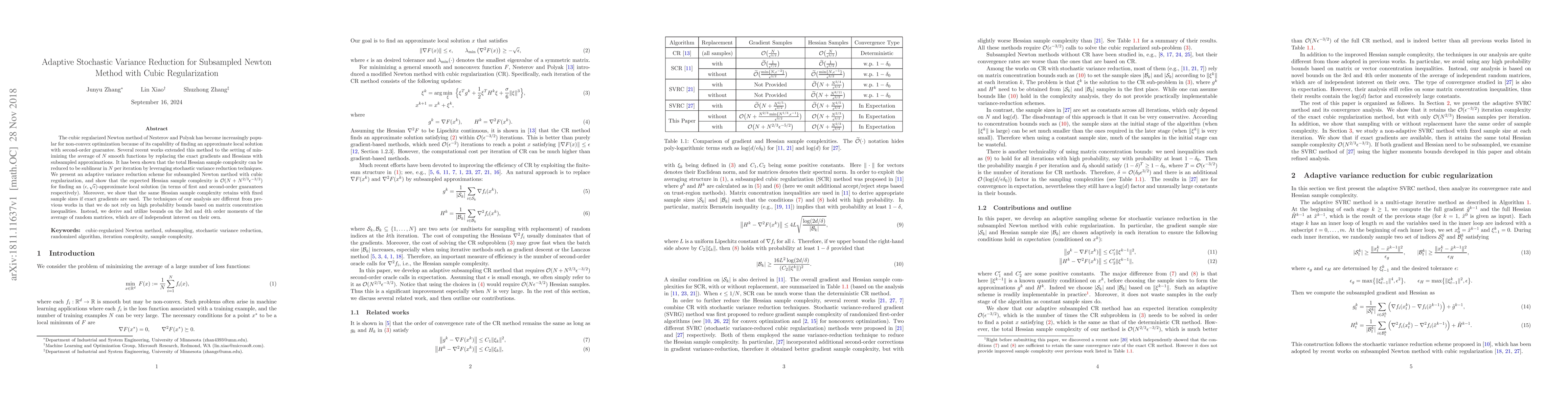 This paper introduces an adaptive variance reduction scheme for the subsampled Newton method with cubic regularization, achieving an expected Hessian sample complexity of O(N + N^{2/3}\epsilon^{-3/2}) for finding an approximate local solution. The analysis leverages bounds on the 3rd and 4th order moments of random matrices, differing from previous works that rely on high probability matrix concentration inequalities.