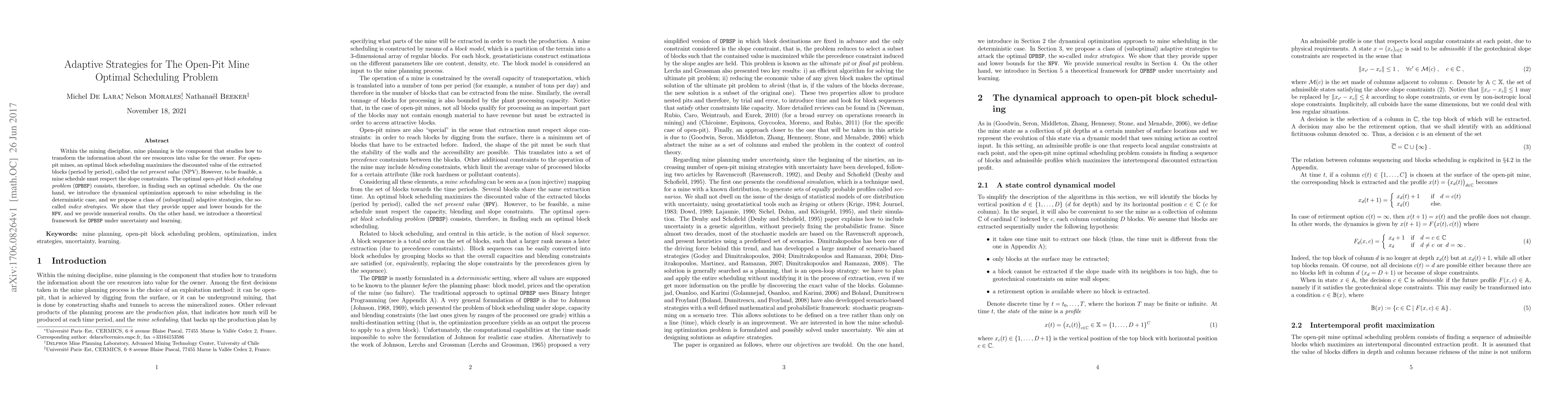 Within the mining discipline, mine planning is the component that studies how to transform the information about the ore resources into value for the owner. For open-pit mines, an optimal block scheduling maximizes the discounted value of the extracted blocks (period by period), called the net present value (NPV). However, to be feasible, a mine schedule must respect the slope constraints. The optimal open-pit block scheduling problem (OPBSP) consists, therefore, in finding such an optimal schedule. On the one hand, we introduce the dynamical optimization approach to mine scheduling in the deterministic case, and we propose a class of (suboptimal) adaptive strategies, the so-called index strategies. We show that they provide upper and lower bounds for the NPV, and we provide numerical results. On the other hand, we introduce a theoretical framework for OPBSP under uncertainty and learning.
