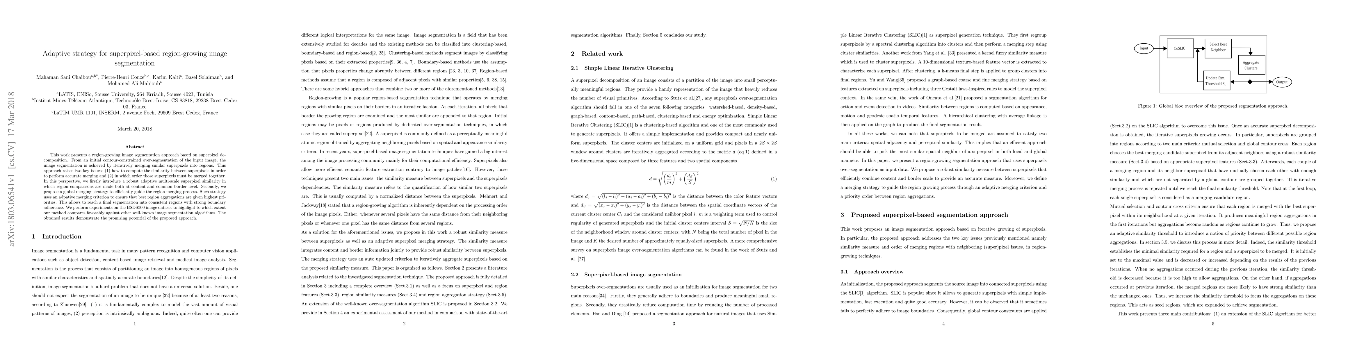 This paper proposes an adaptive region-growing segmentation method based on superpixel decomposition, addressing superpixel similarity computation and merging order. It introduces an adaptive multi-scale similarity measure and a global merging strategy to prioritize optimal region aggregations, achieving consistent segmentation with strong boundary adherence.
