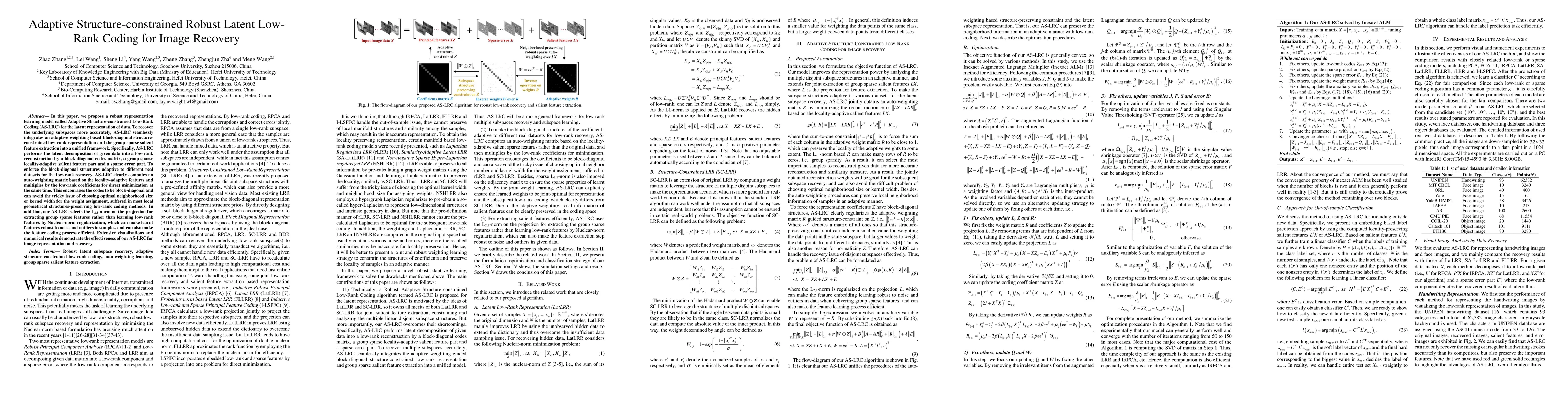 This paper introduces Adaptive Structure-constrained Low-Rank Coding (AS-LRC) for robust latent representation learning, integrating adaptive weighting and group sparse salient feature extraction to enhance image recovery. AS-LRC employs a block-diagonal structure and L2,1-norm for group sparse features, improving robustness and efficiency.