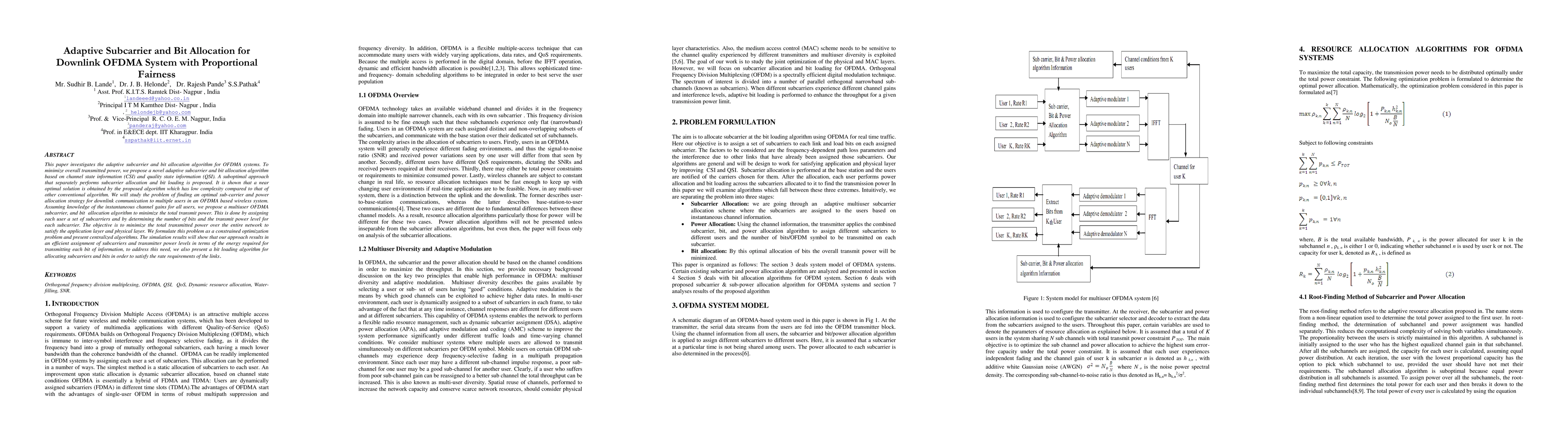 This paper proposes an adaptive subcarrier and bit allocation algorithm for OFDMA systems to minimize total transmitted power while ensuring proportional fairness among users. The algorithm uses channel state information and formulates the problem as a constrained optimization, achieving a near-optimal solution with low complexity.