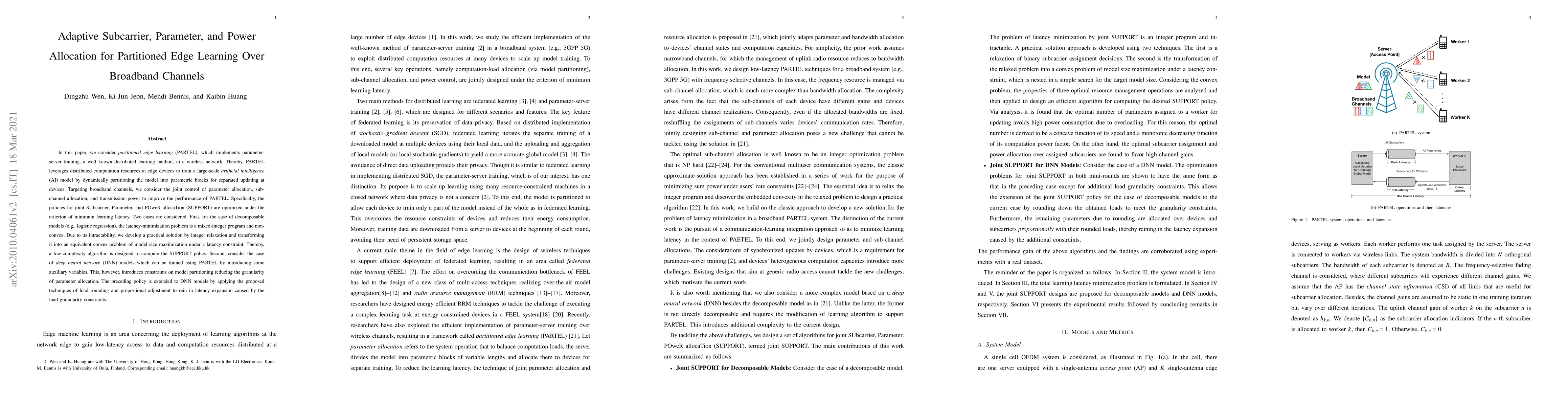 This paper proposes adaptive algorithms for subcarrier, parameter, and power allocation in partitioned edge learning over broadband channels to minimize learning latency. For decomposable models, a low-complexity algorithm is developed through integer relaxation and convex optimization. For deep neural networks, techniques like load rounding and proportional adjustment are introduced to manage latency caused by model partitioning constraints.