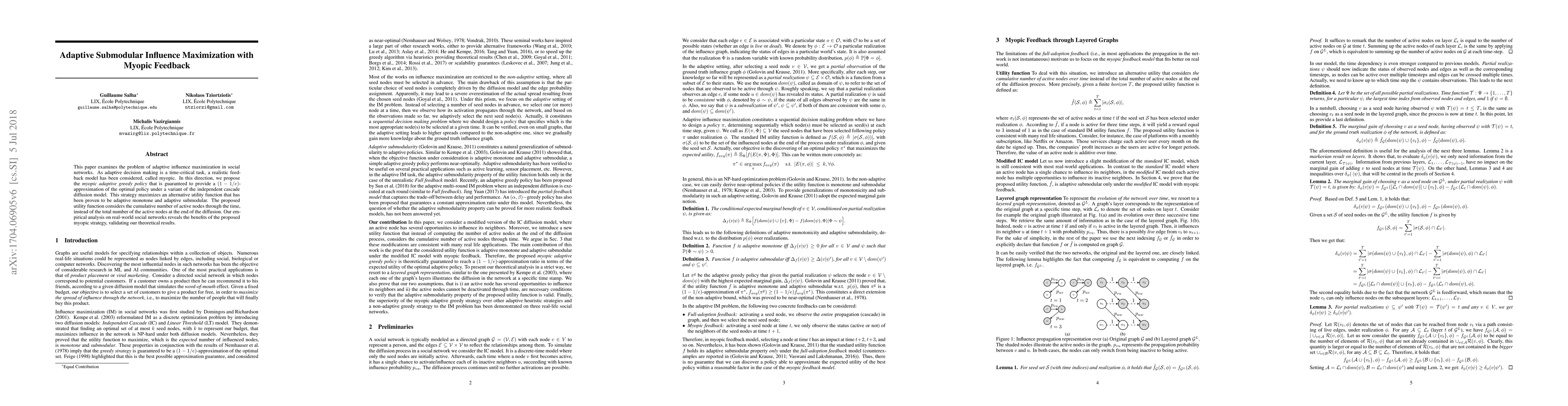 The paper proposes the myopic adaptive greedy policy for the problem of adaptive influence maximization in social networks, utilizing a variant of the independent cascade diffusion model and myopic feedback.