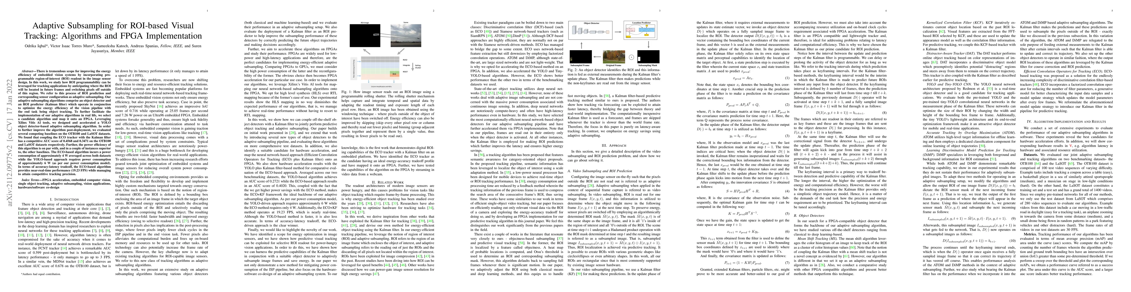 This work is novel in its approach to adaptive subsampling for visual tracking, integrating off-the-shelf object detectors with a Kalman filter for efficient sensor reconfiguration. The paper also showcases the hardware implementation of these algorithms on an FPGA, targeting energy optimization in embedded vision systems.