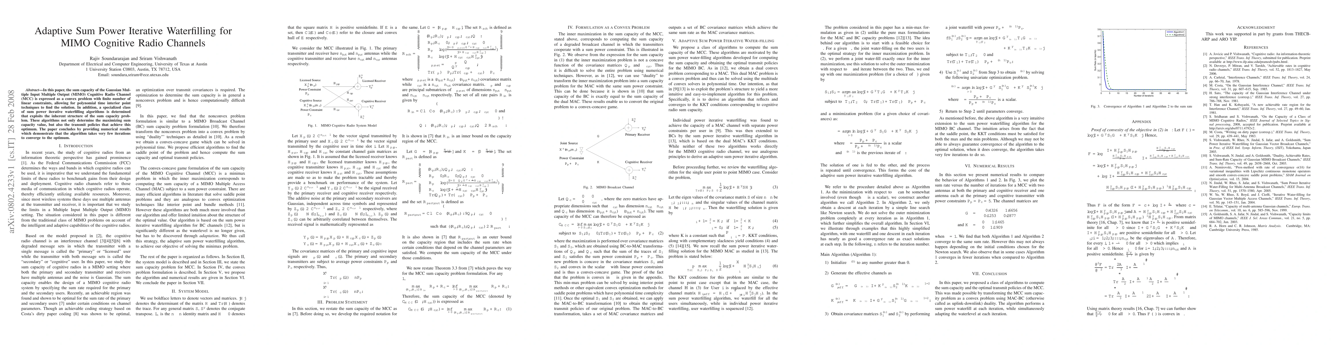 This paper proposes adaptive sum power iterative waterfilling algorithms for optimizing the sum capacity of MIMO Cognitive Radio Channels, leveraging convex optimization and interior point methods. The developed algorithms efficiently determine both the optimal sum capacity and corresponding transmit policies, with numerical results showing rapid convergence.