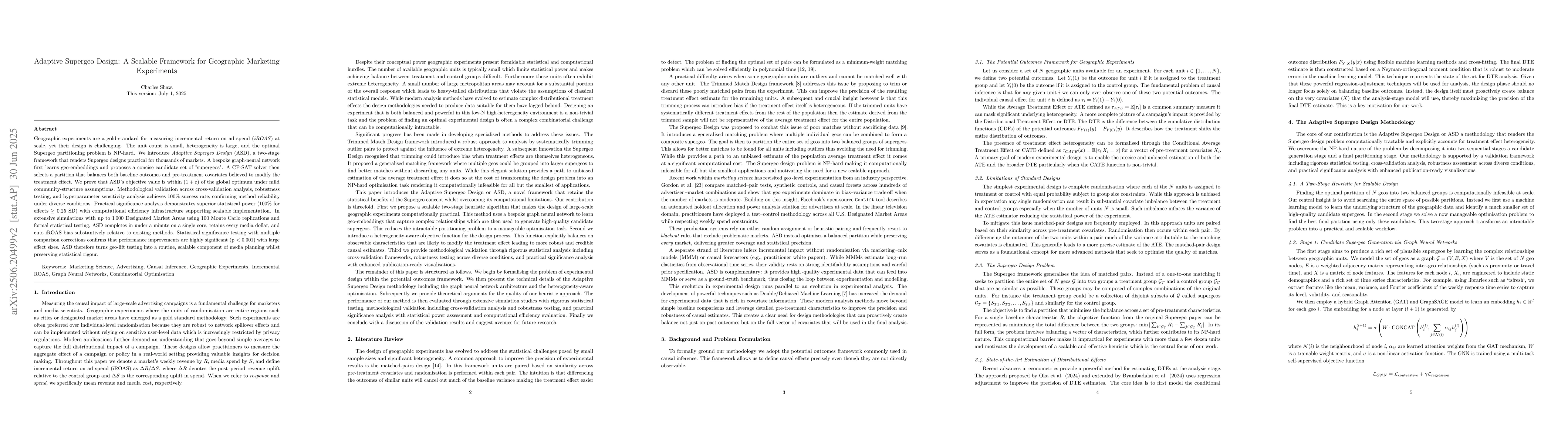 The paper introduces Adaptive Supergeo Design (ASD), a two-stage framework that simplifies the complex task of designing geographic marketing experiments for large-scale analysis. ASD uses a graph-neural network to suggest 'supergeos' and a CP-SAT solver to optimize partitioning, ensuring statistical rigor while significantly reducing iROAS bias compared to existing methods. It completes in minutes on standard hardware, making geo-lift testing routine and scalable for media planning.